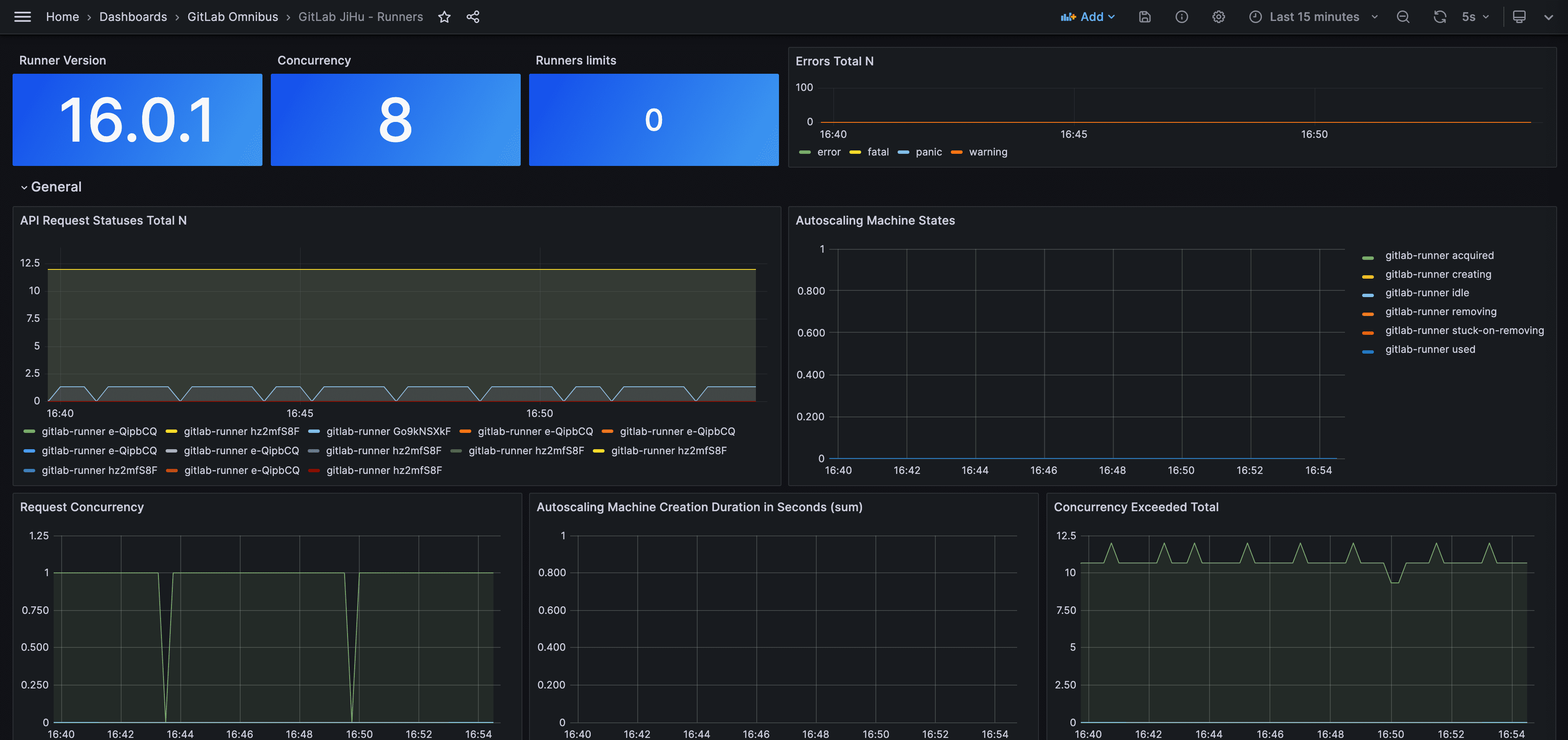 The GitLab Self-managed - Runners dashboard uses the prometheus data source to create a Grafana dashboard with the graph, stat and timeseries panels.