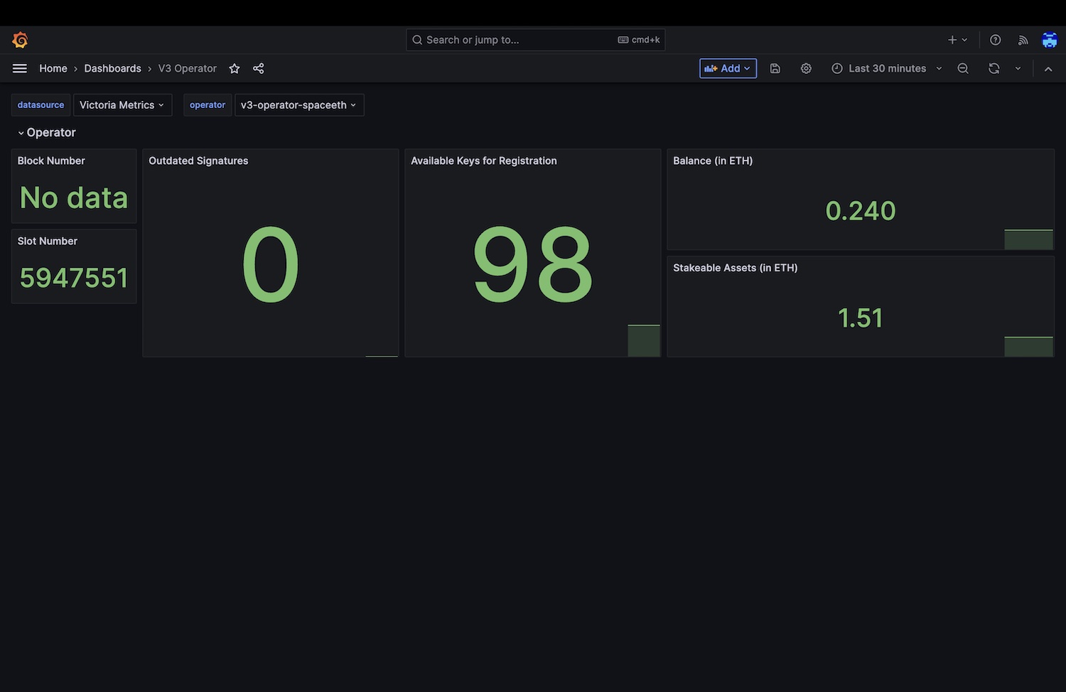 The V3 Operator dashboard uses the prometheus data source to create a Grafana dashboard with the stat panel.