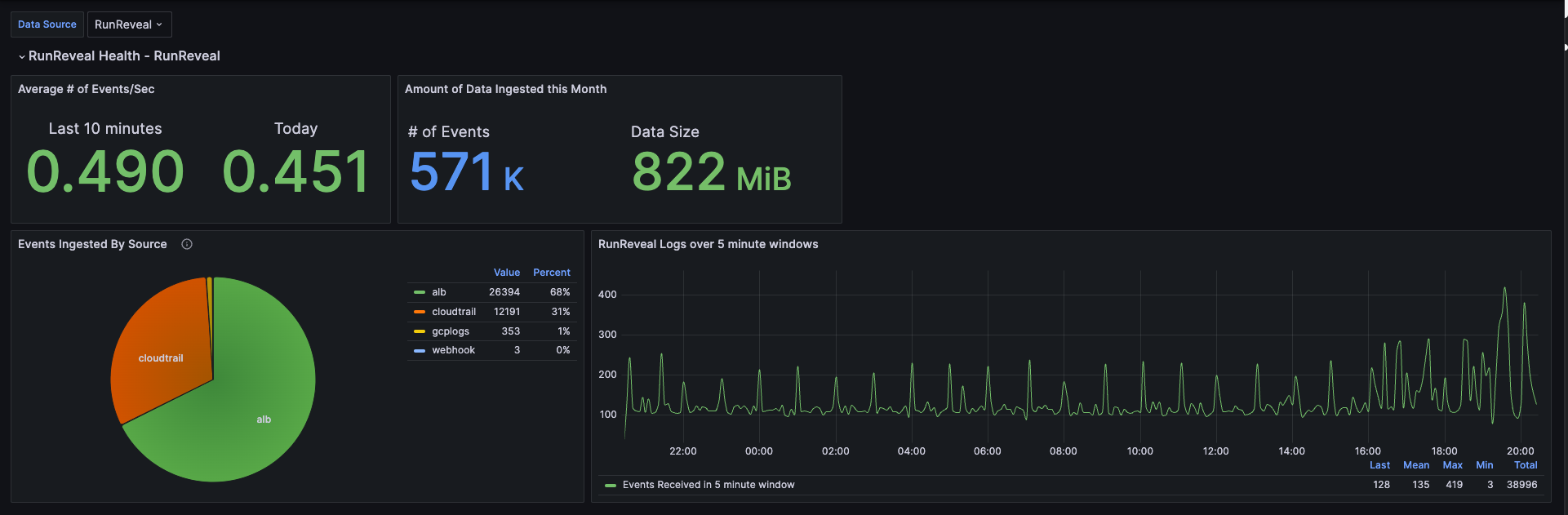 This dashboard uses the RunReveal Grafana data source to show important information about your RunReveal events.