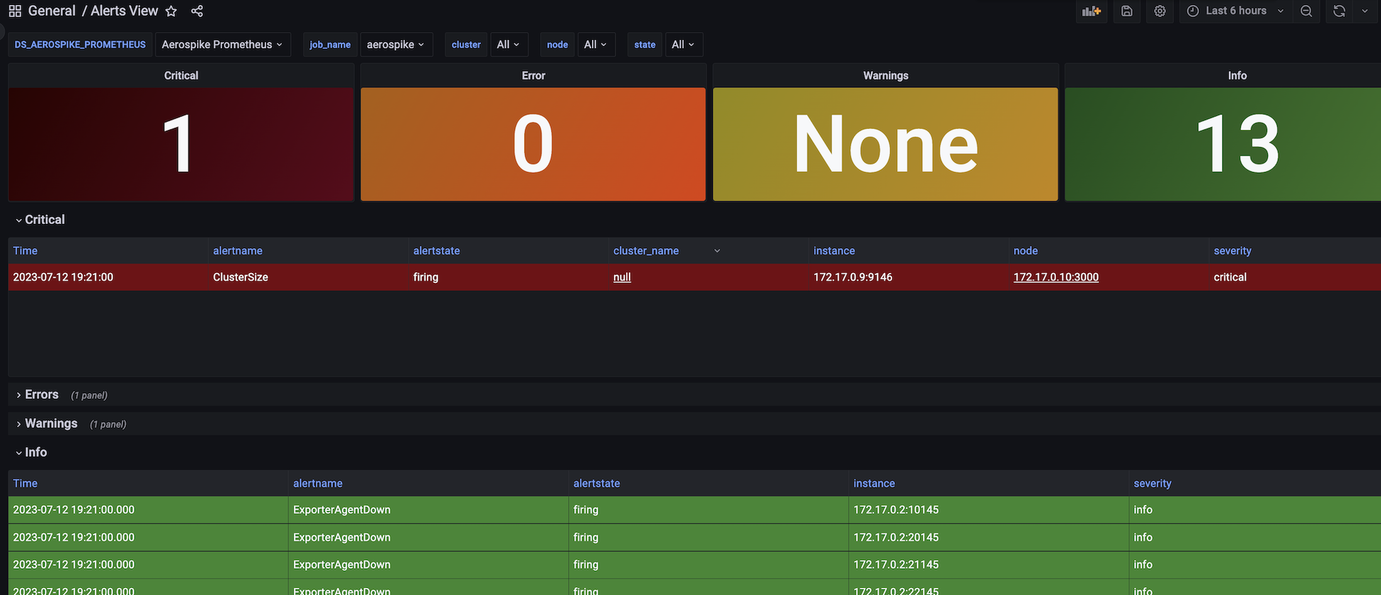 Alerts View dashboard for Aerospike Monitoring Stack