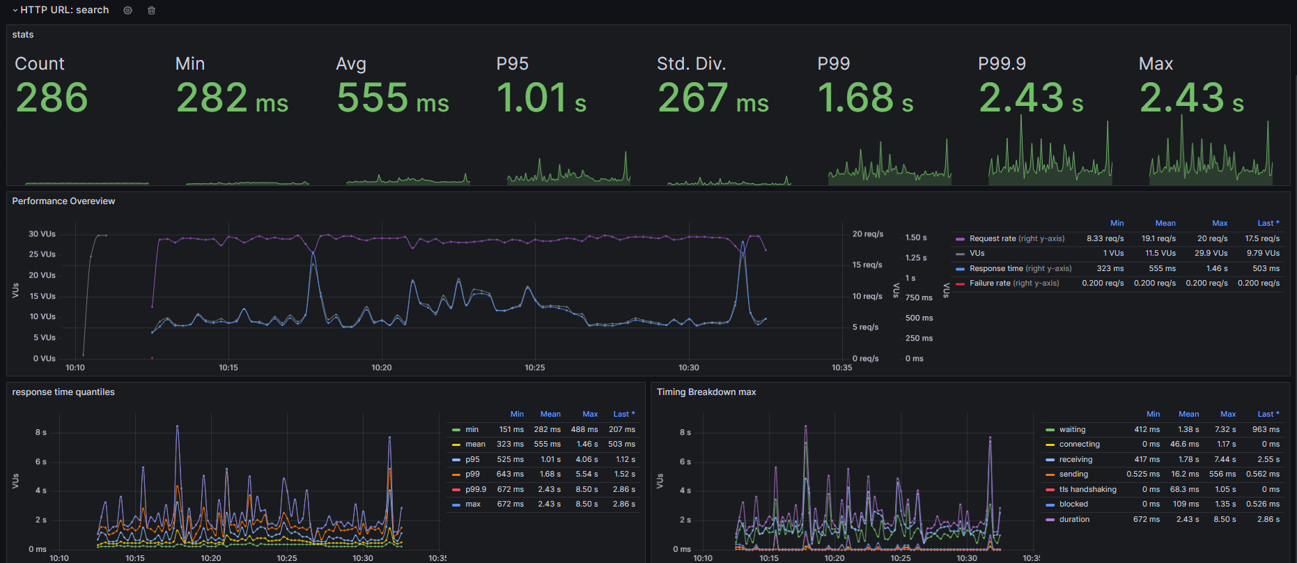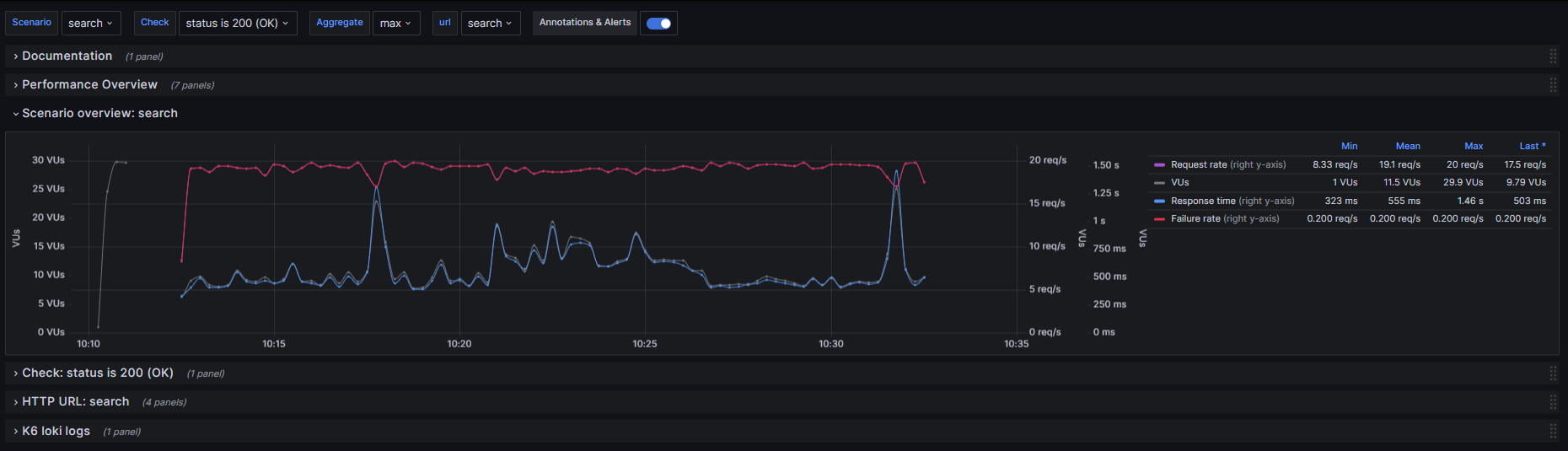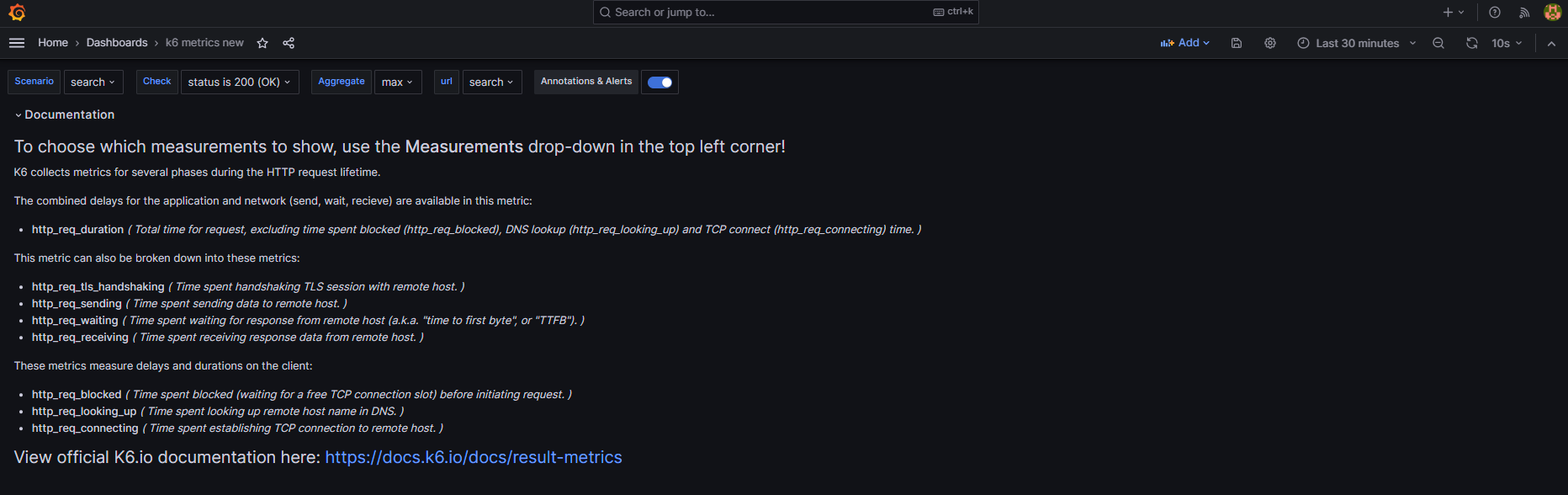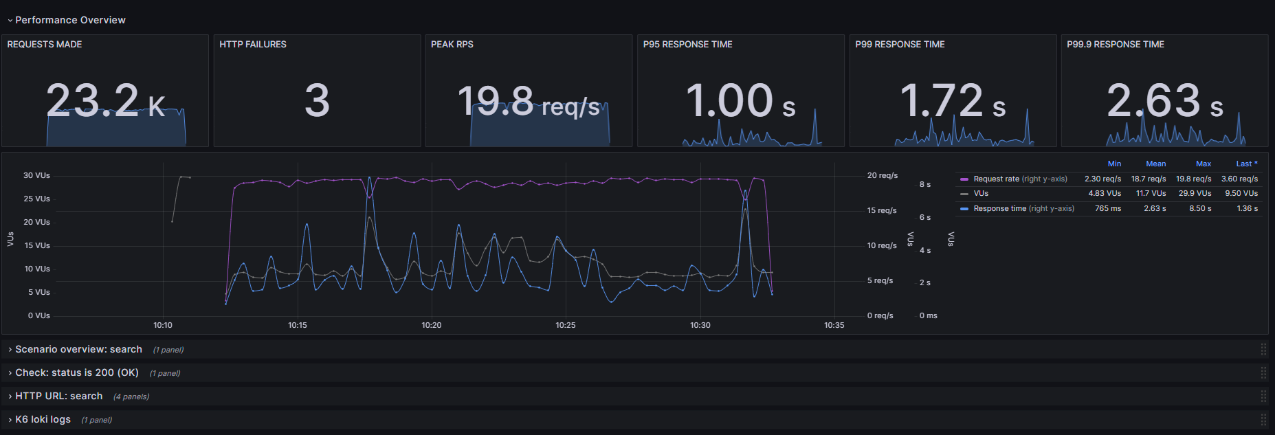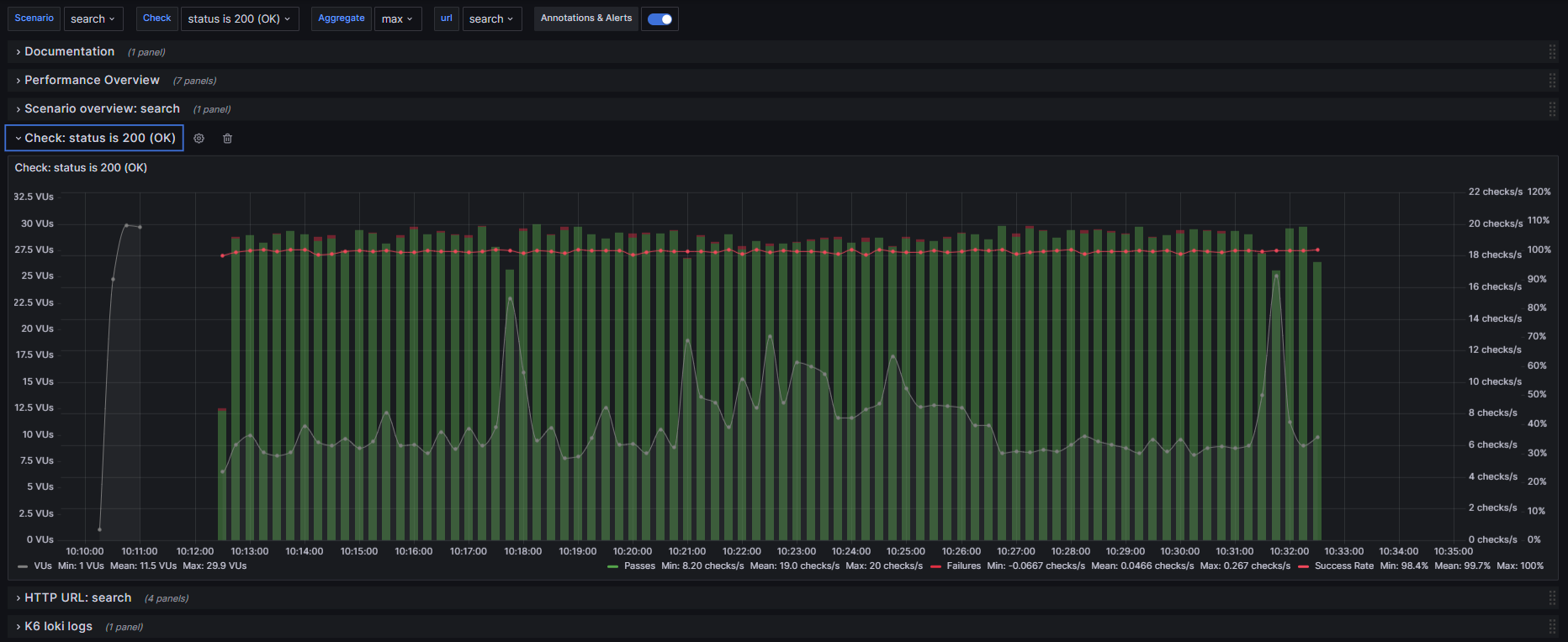This board uses InfluxDB (version <2) and Loki to monitor load tests conducted using K6. The board allows to work with multiple scenarios and checks. It is also possible to aggregate the values on the board using a selector for min,mean,max,p50,p75,p95,p99 and p99.9.
