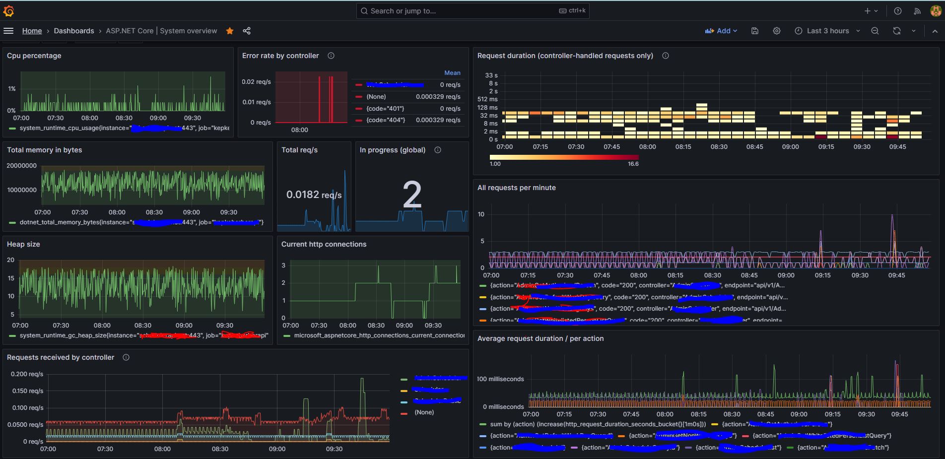The ASP.NET Core | System overview dashboard uses the prometheus data source to create a Grafana dashboard with the graph, heatmap, stat and timeseries panels.