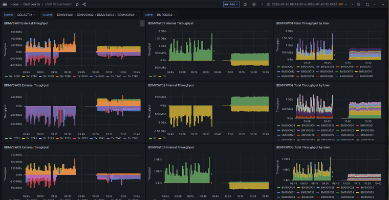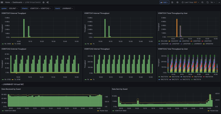 The dashboard shows throughput of z/VM® Virtual Switch used to provide network connectivity to guests. For each of the selected virtual switches, charts show inbound and outbound traffic over time, for the external interfaces as well as aggregated for all connected virtual network interfaces.