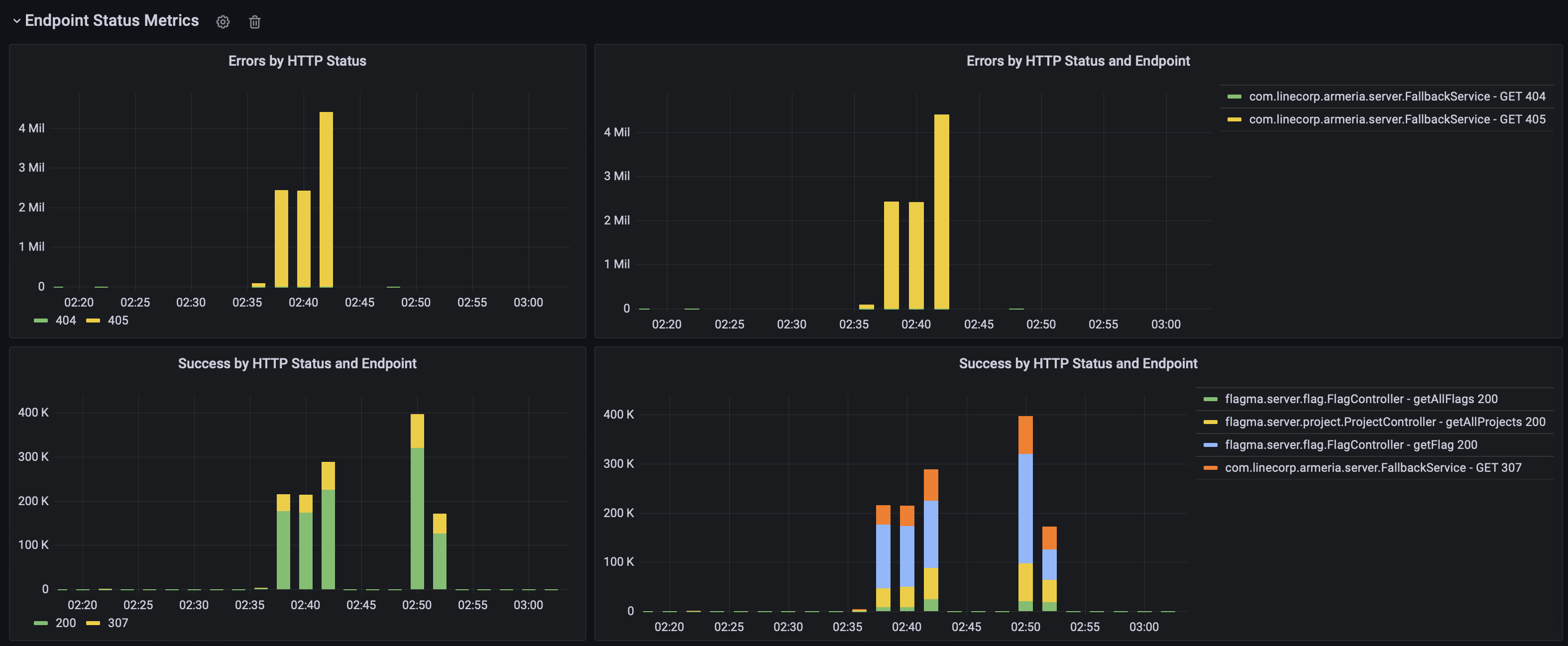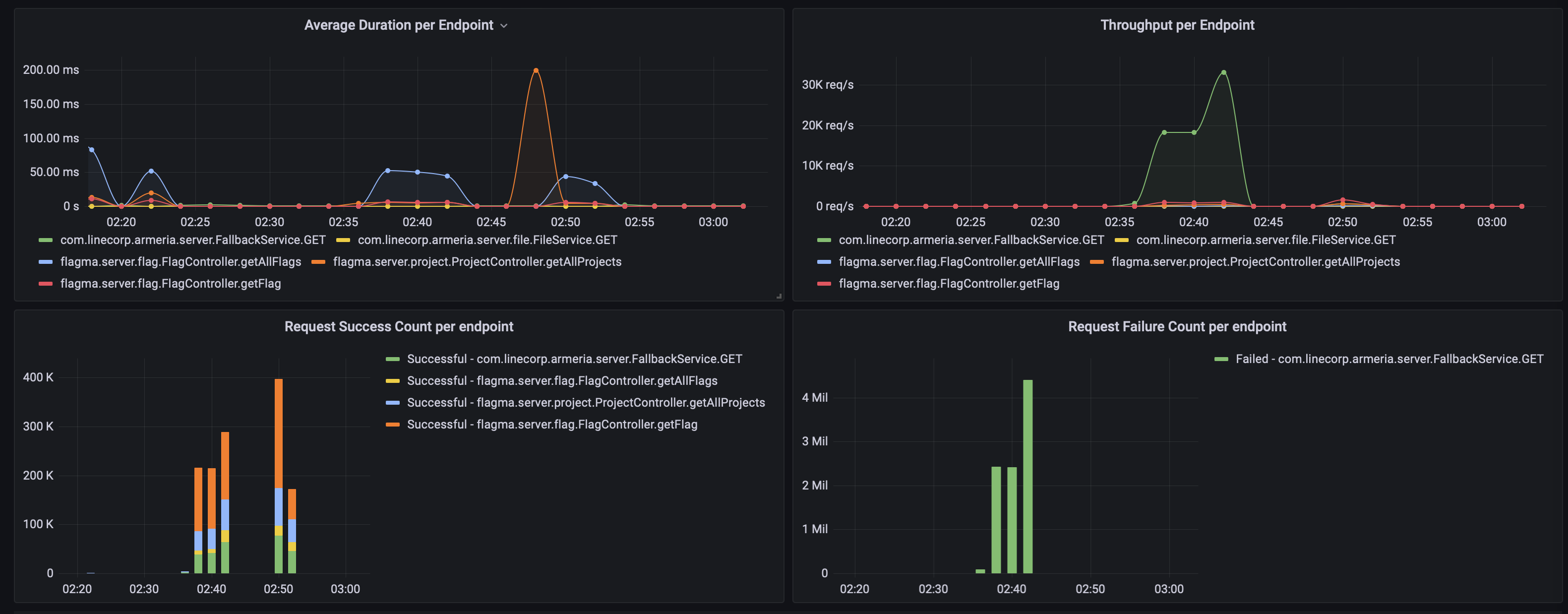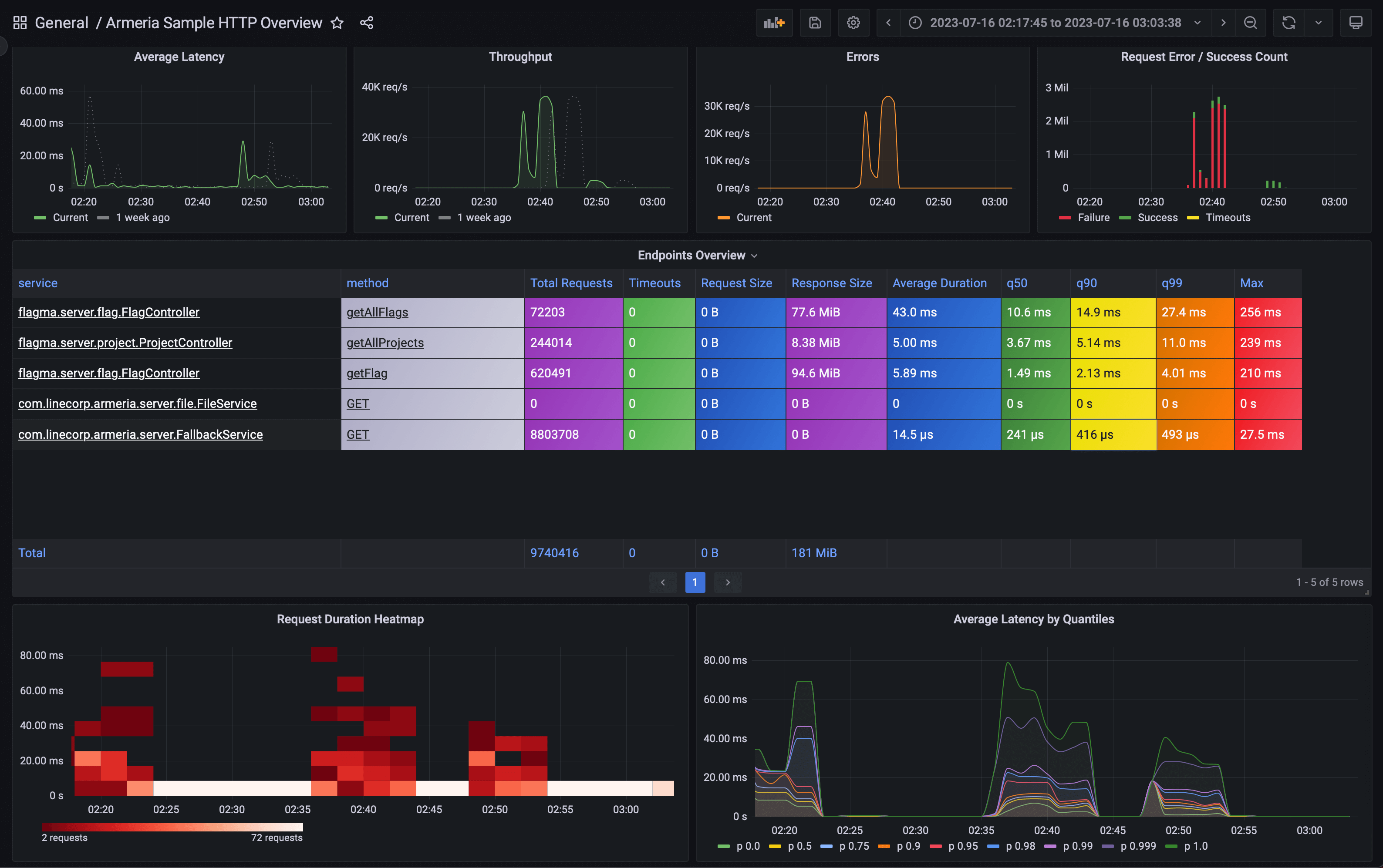 Please also check Armeria Endpoint Statistics dashboard to enable navigation to endpoint statistics by clicking on endpoint names.
