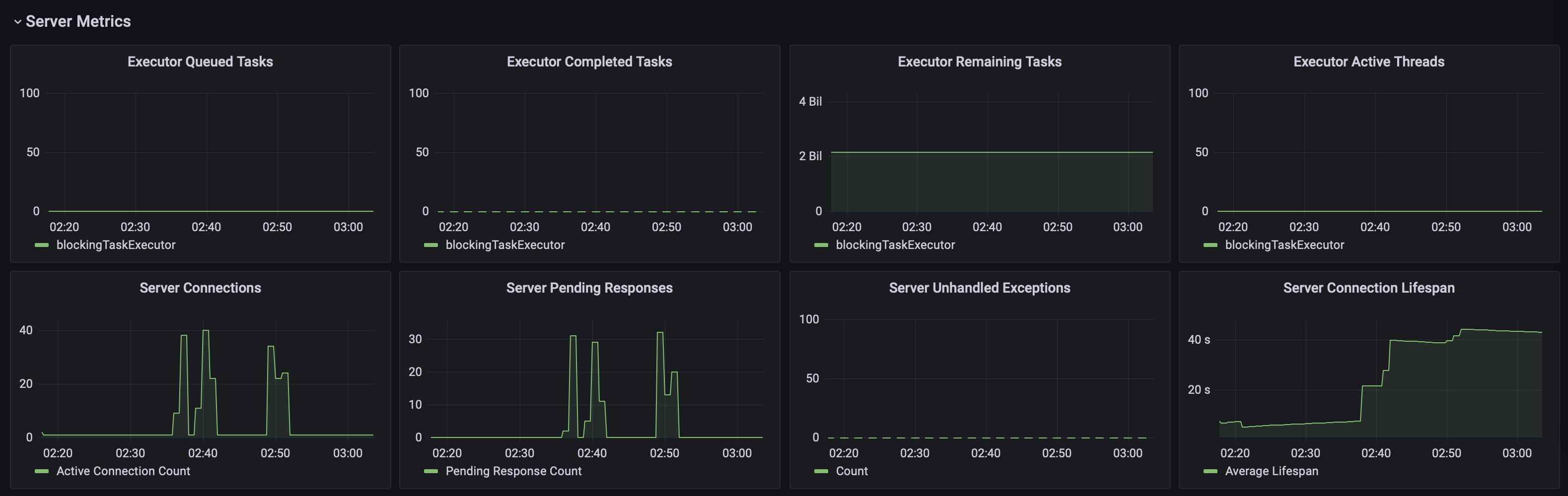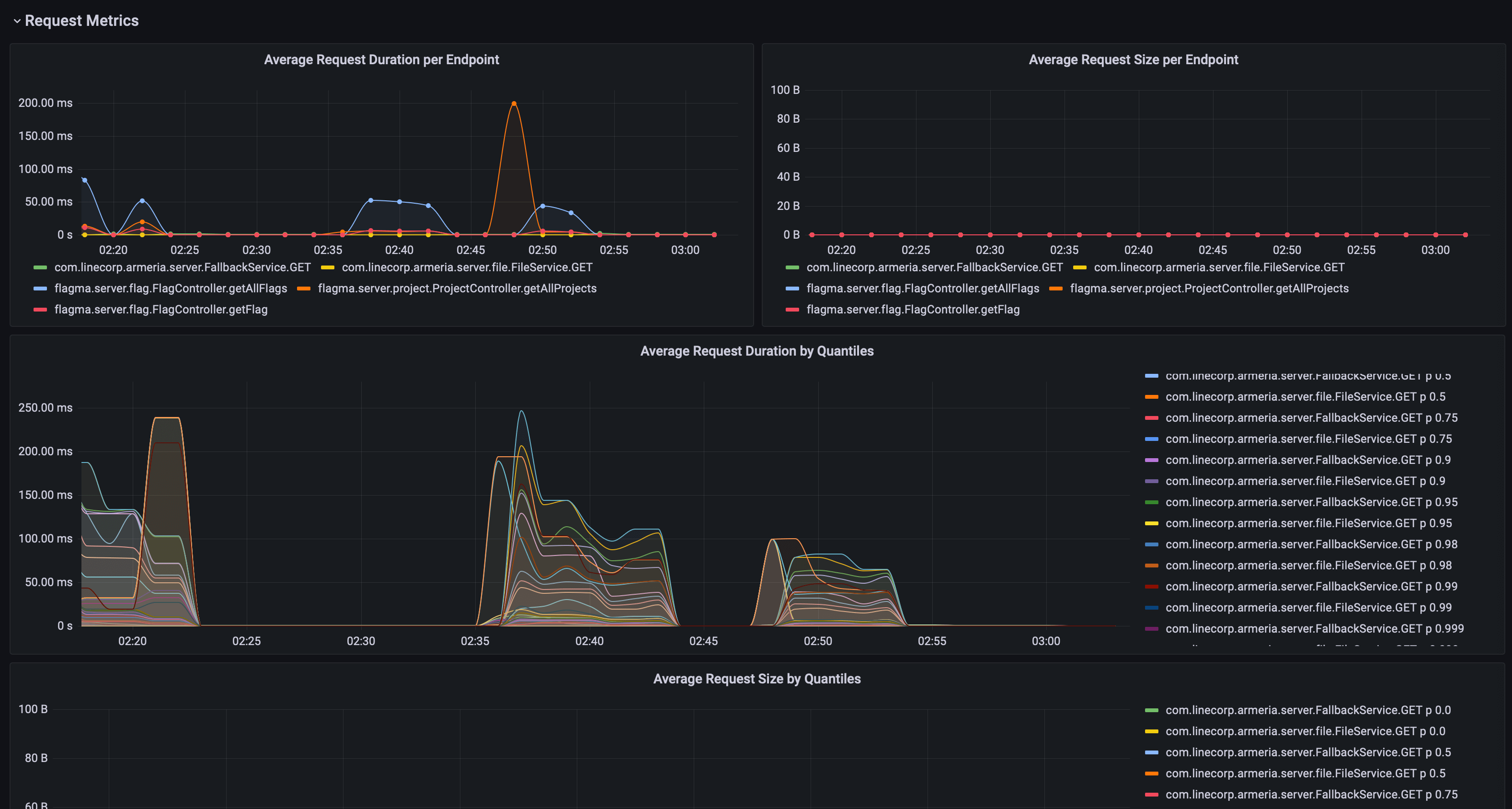 This dashboard uses the default metrics exported by Armeria as described in Collecting Metrics.