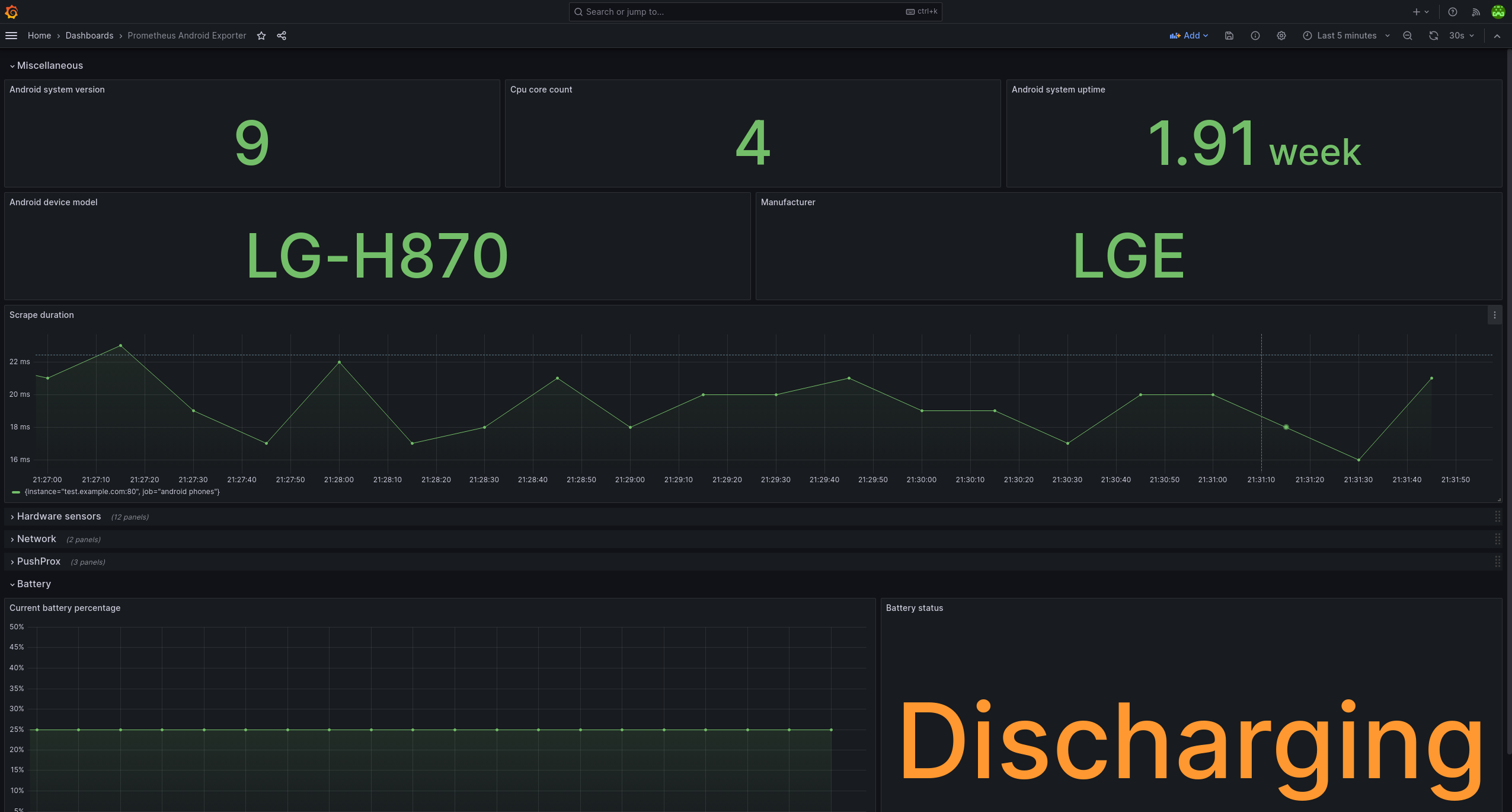 This dashboard shows most of the metrics exported by the Prometheus Android Exporter available at https://github.com/birdthedeveloper/prometheus-android-exporter. This dashboard is intended to help you start quickly when analyzing data from the Prometheus Android Exporter.