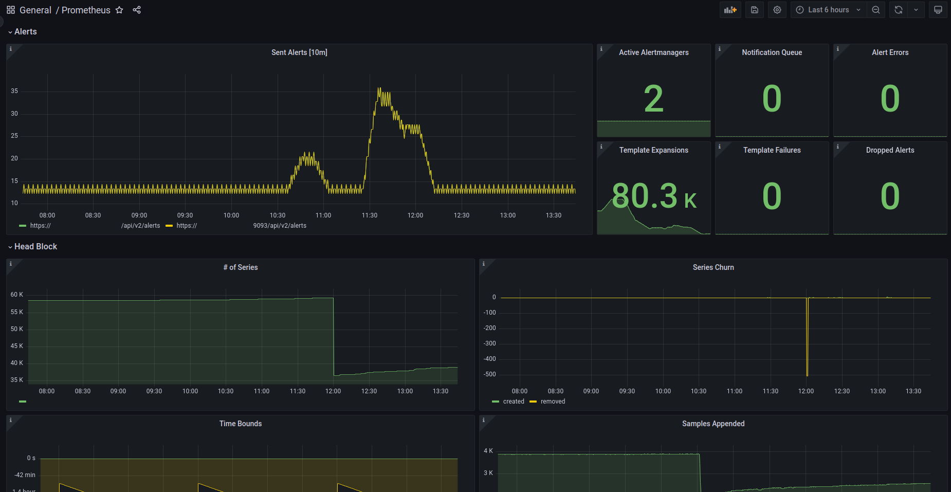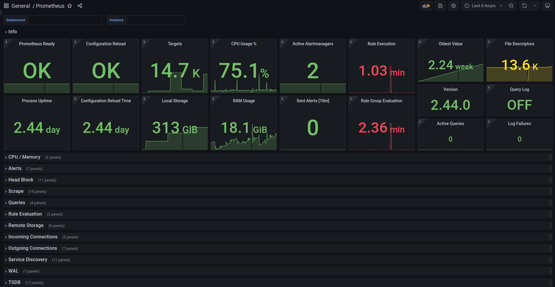 This dashboard includes panels for almost all internal Prometheus metrics.