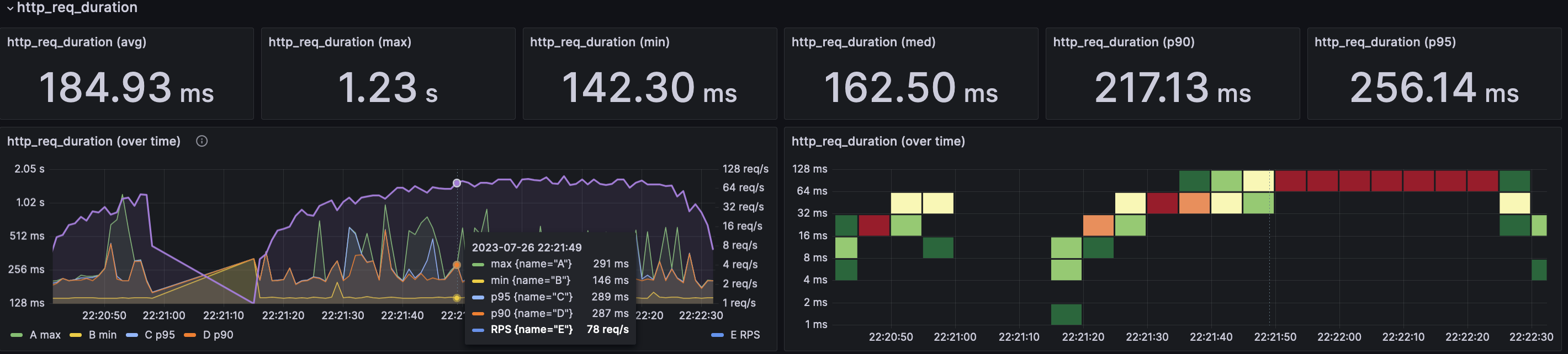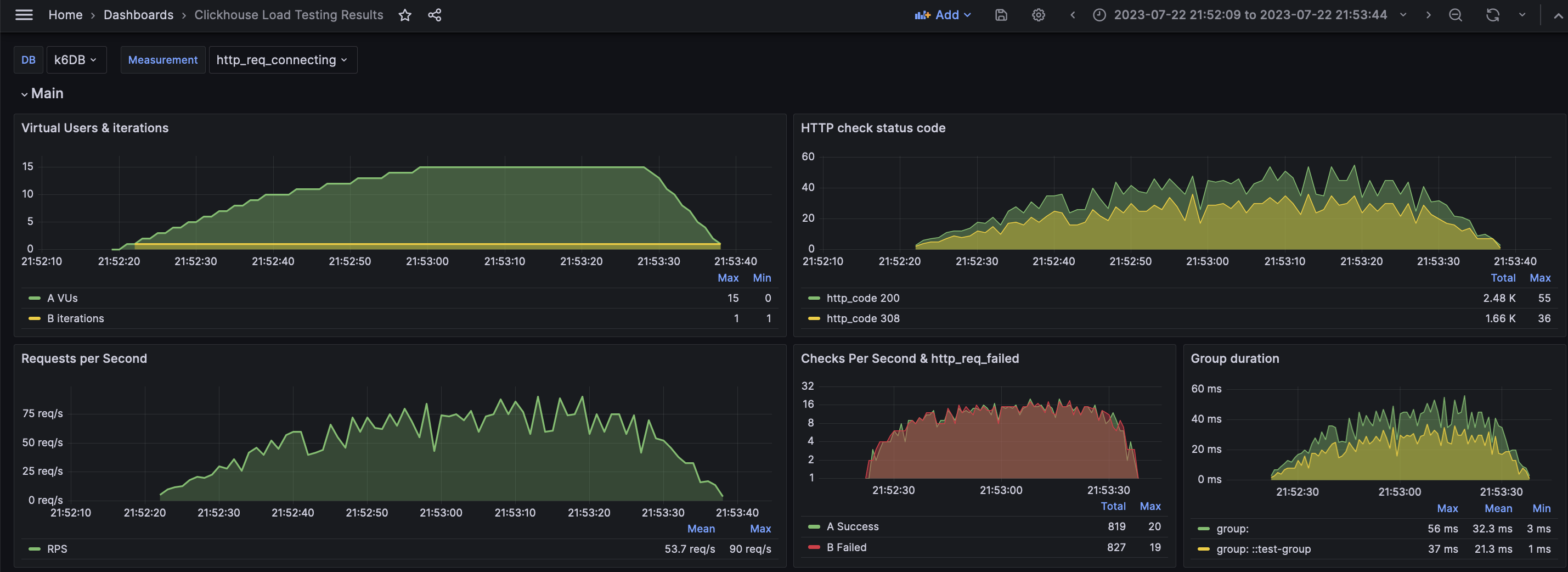 A dashboard for visualizing results from the k6.io load testing tool, using the ClickHouse exporter