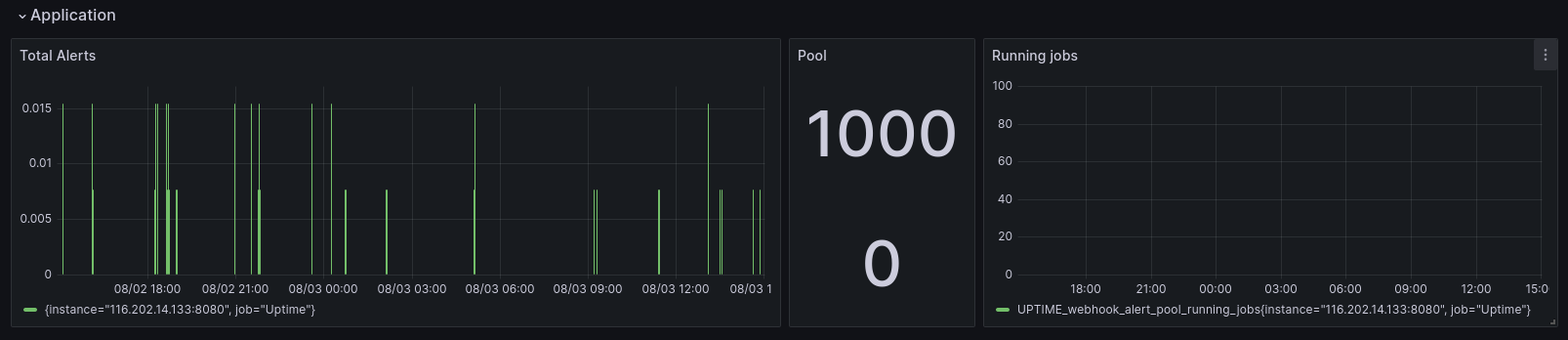 The Uptime Webhook dashboard uses the prometheus data source to create a Grafana dashboard with the stat and timeseries panels.