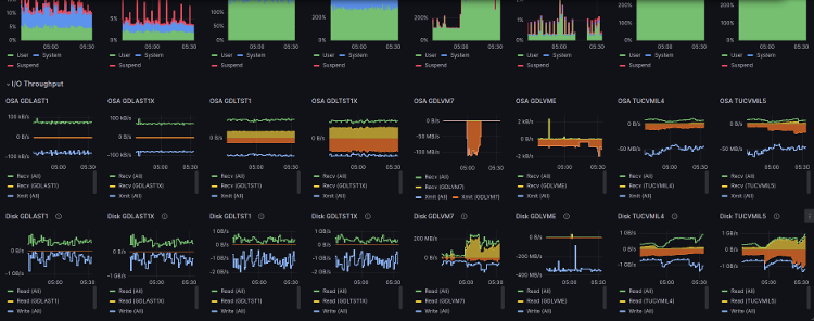 The dashboard is intended to provide an overview of multiple z/VM® systems in a single dashboard, not necessarily restricted to the same Single System Image (SSI). For each of the selected z/VM systems, the dashbooard shows CPU, memory, network and disk I/O metrics.