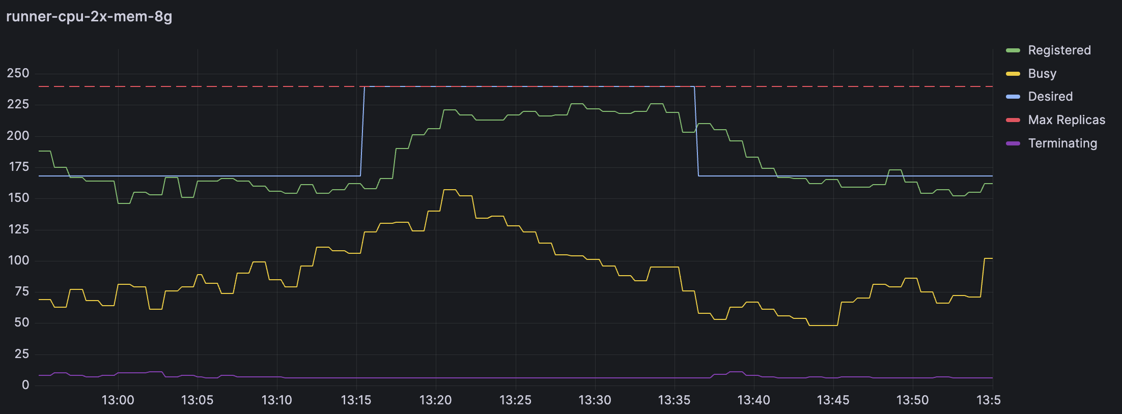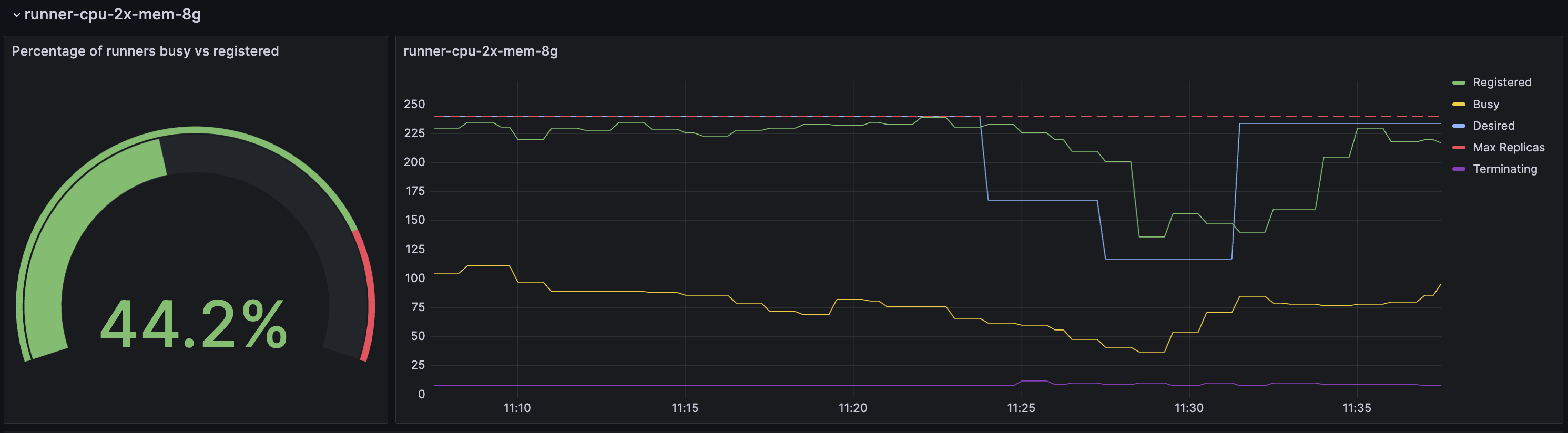 This dashboard adds observability to the Horizontal Runner Autoscalers (HRA). It automatically scans some ARC metrics to display the behaviour of all your HRAs.