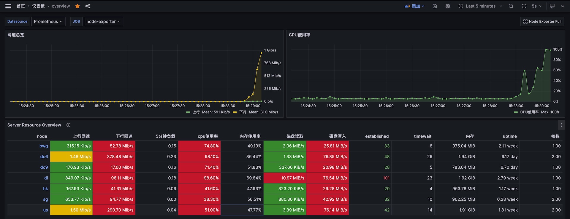 The overview dashboard uses the prometheus data source to create a Grafana dashboard with the table and timeseries panels.