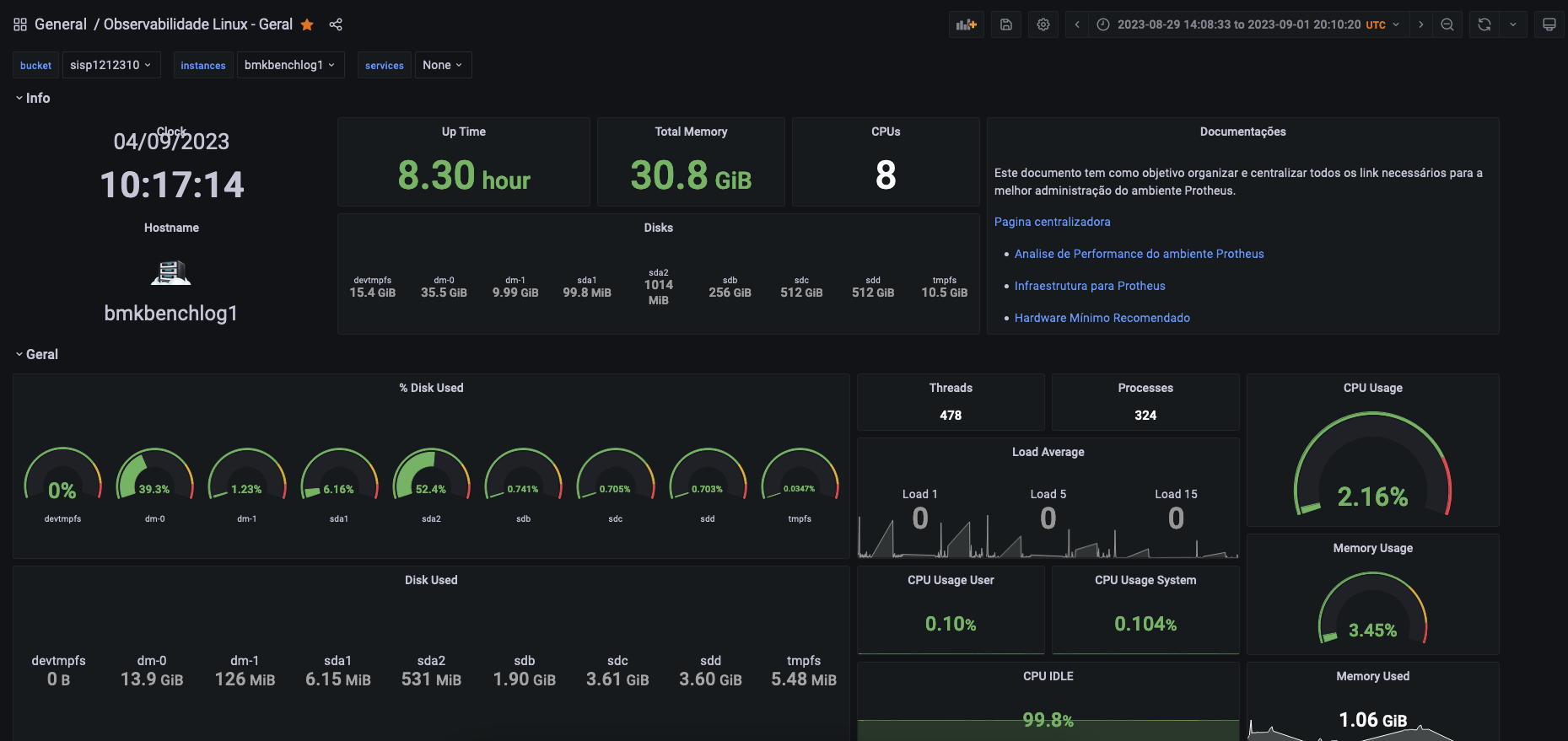 O dashboard Observability - Protheus Environment (Linux Detail), fornece uma visão geral das maquinas, é uma visão genérica que monitora os principais recursos.