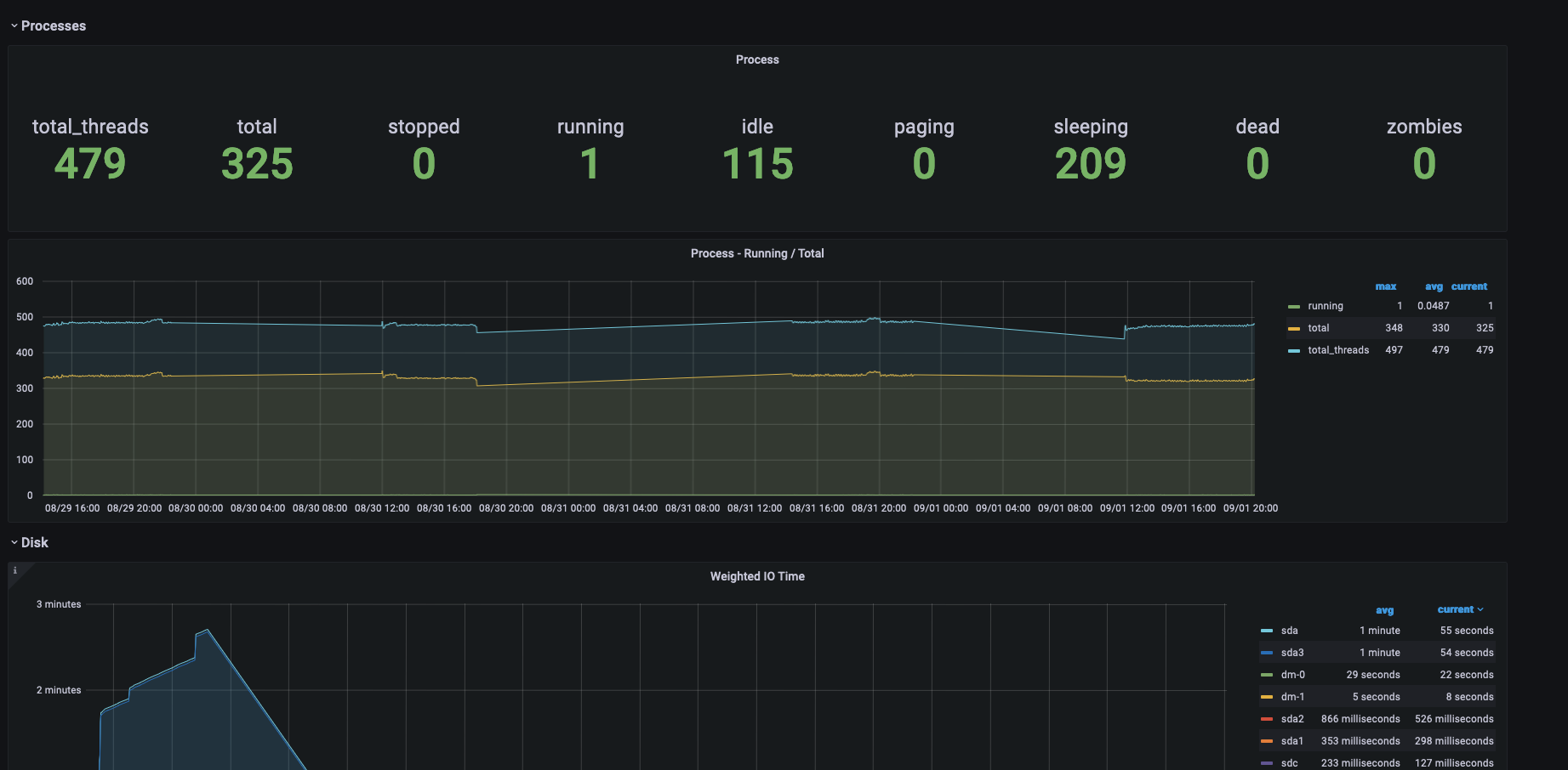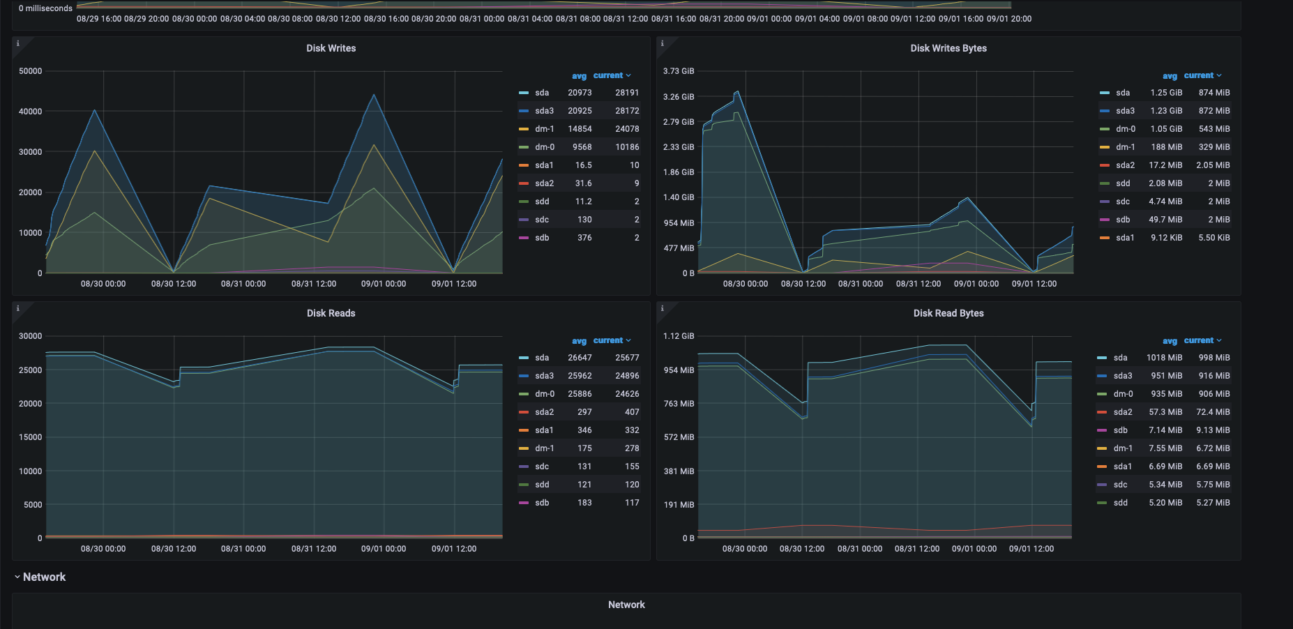 Porcentagem e valor absoluto de consumo dos disco (% Disk Used e Disk Used);