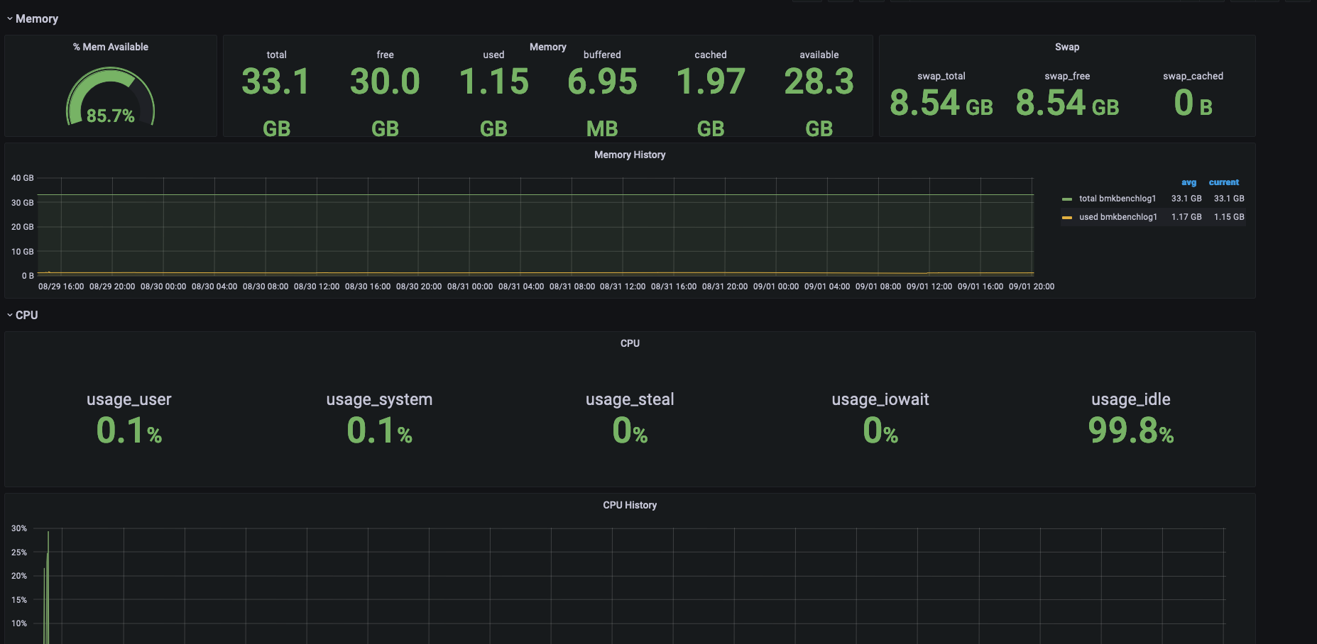 Consumo de memória em porcentagem e valor absoluto (Memory Usage);