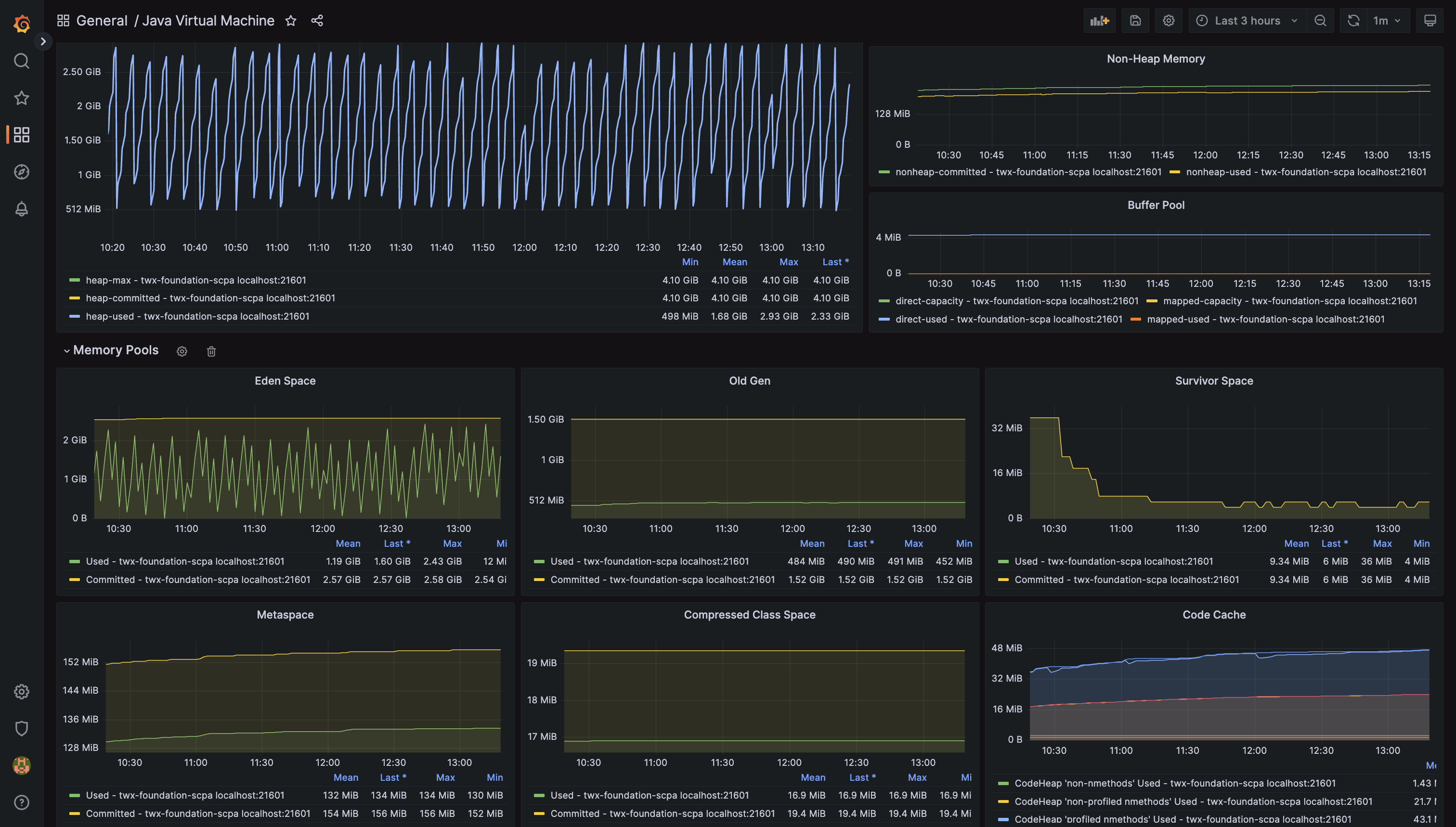 The following JMX Exporter configuration selectively collects specific relevant MBean attributes from the Java Virtual Machine. Contrary to using a wildcard pattern, this allows for specifically applying labels with things like pool names, as well as standardising on metric names across JVM versions and configurations.