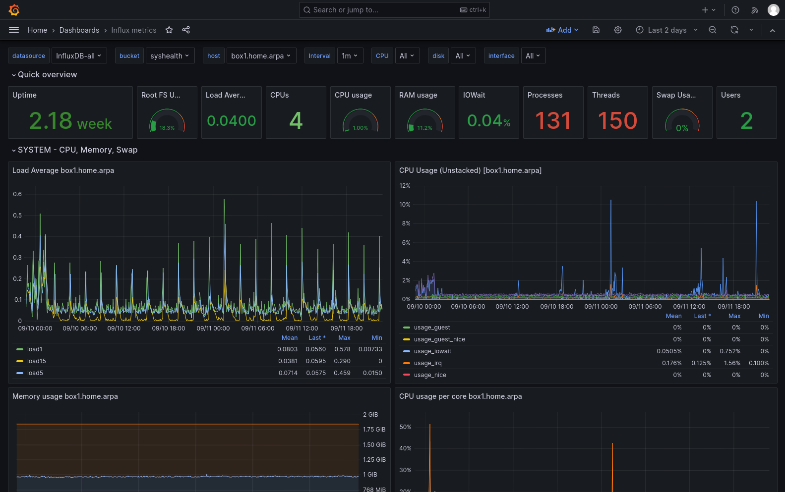 Dashboard for displaying basic host metrics collected by telegraf and stored into the InfluxDB 2.0. Metrics are fetched by flux.
