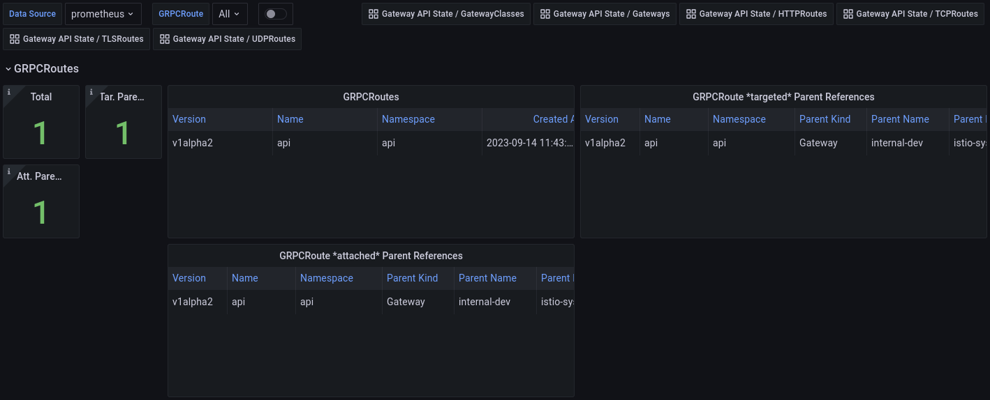 The dashboard shows a list of all GRPCRoutes in your kubernetes cluster, including targeted and attached Parent References. A set of summary single stat panels show aggregations of the same.