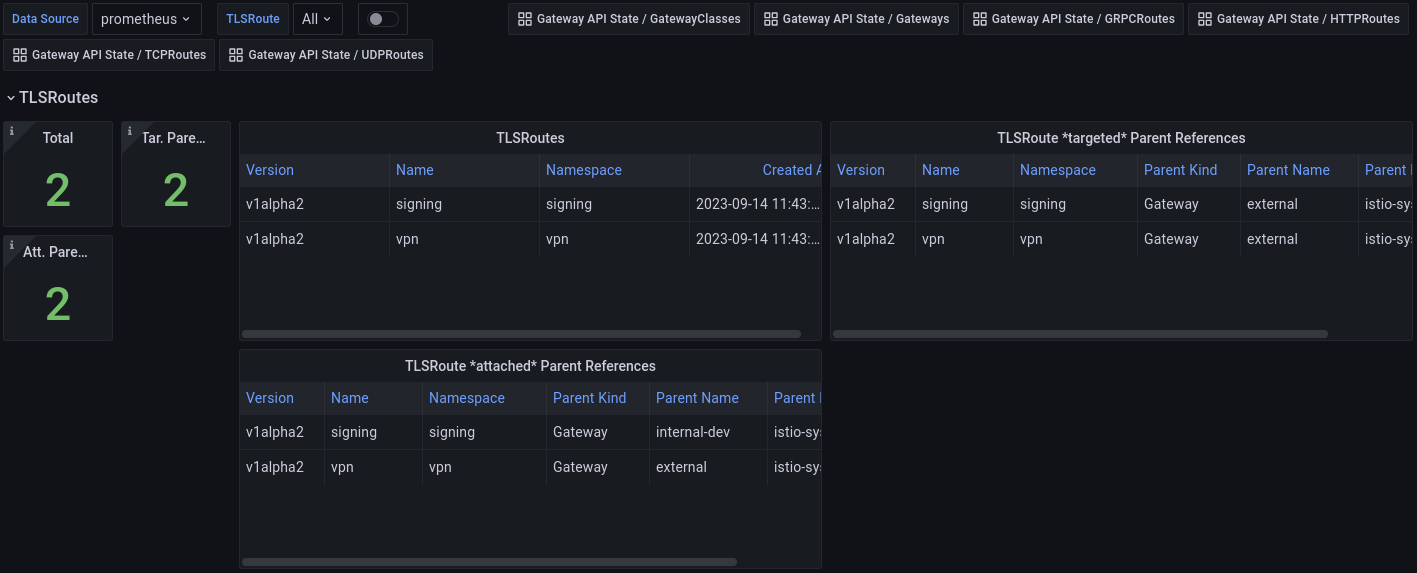 The dashboard shows a list of all TLSRoutes in your kubernetes cluster, including targeted and attached Parent References. A set of summary single stat panels show aggregations of the same.