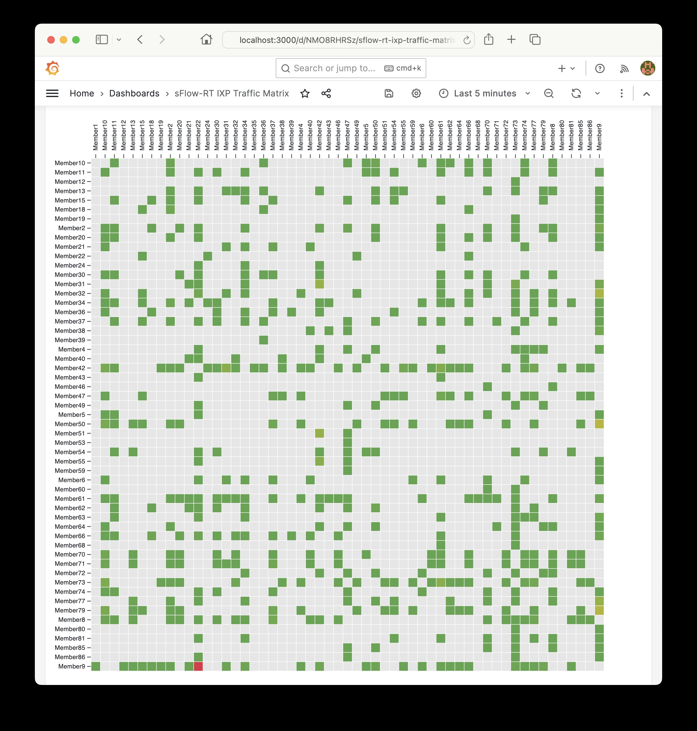 This dashboard shows Internet eXchange Provider (IXP) member to member traffic matrix reported by sFlow-RT analyzer running the ixp-metrics application. The sFlow-RT analysis software collects streaming telemetry from industry standard sFlow Agents embedded in network devices.