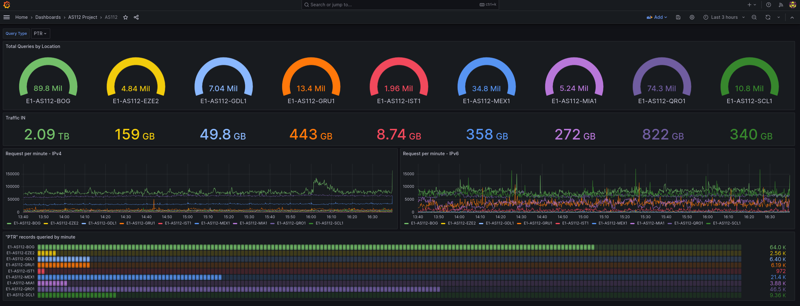 This dashboard is intended to see the metrics of AS112 project. You need to have a Telegreaf sending data to a InfluxDB2, in this case with bucket name "as112". Telegraf standard config with just 2 input plugins "net" and "netstat". You can add others including bind to have more data.