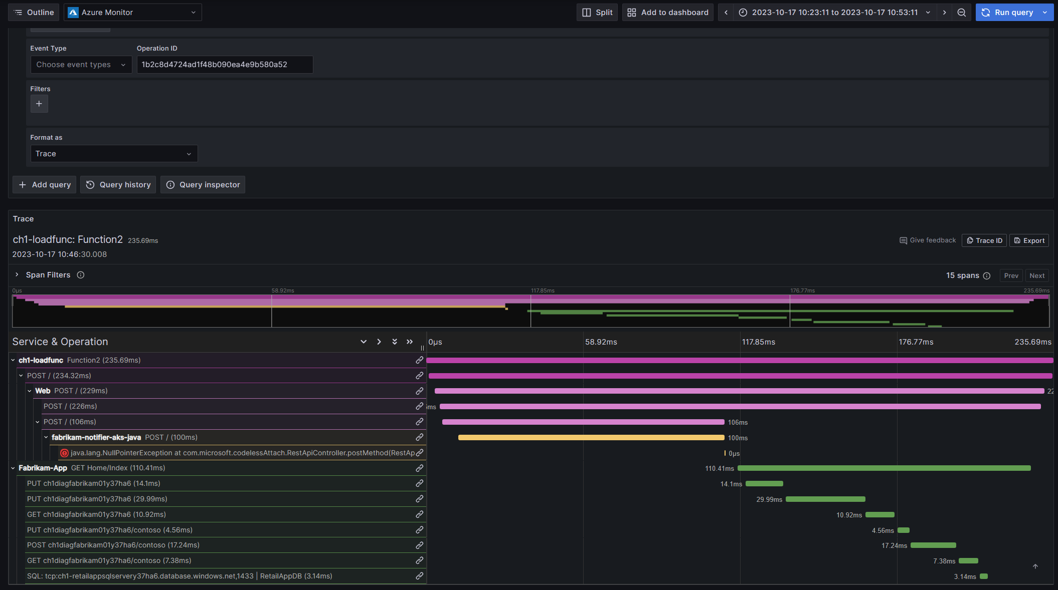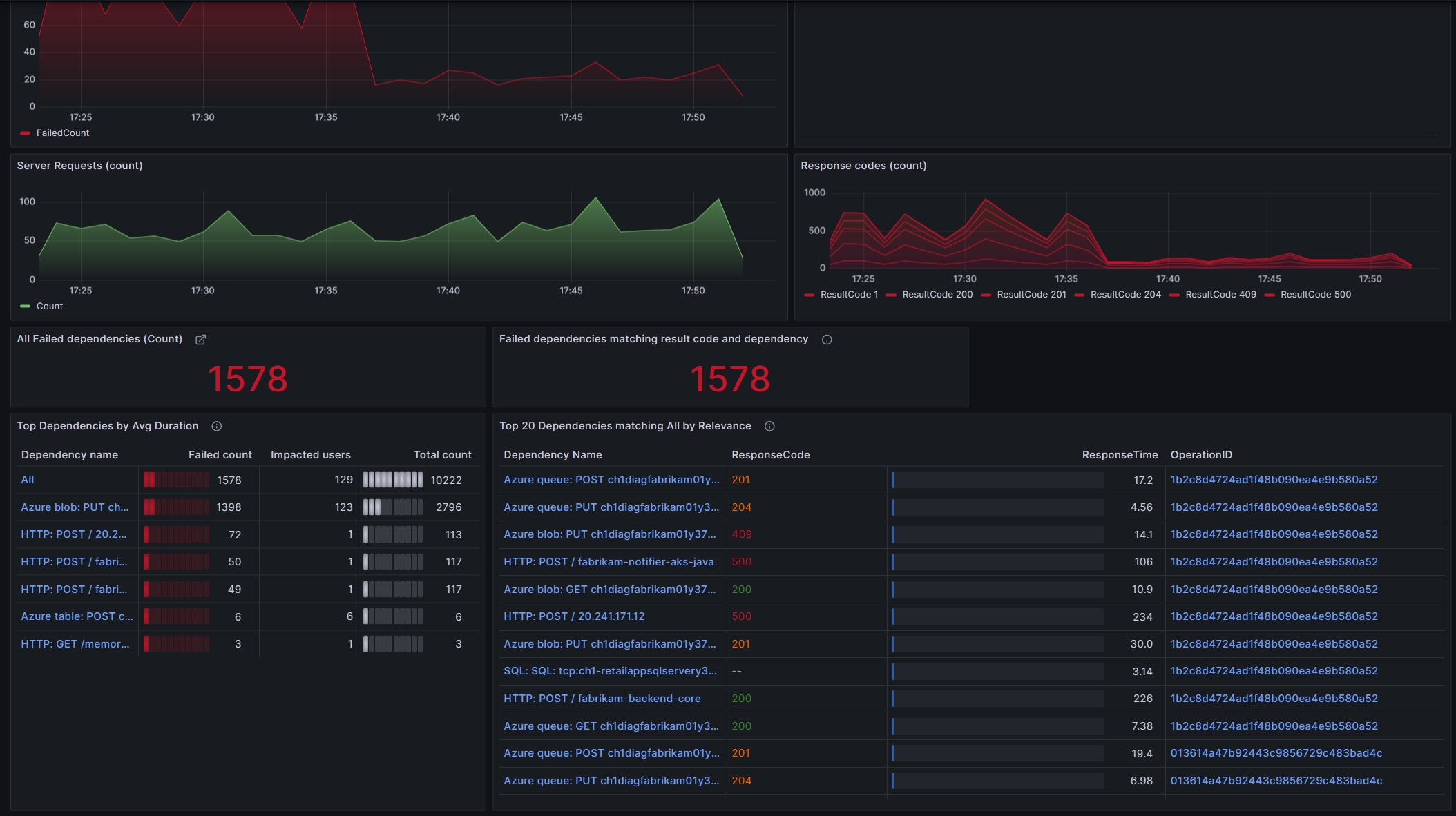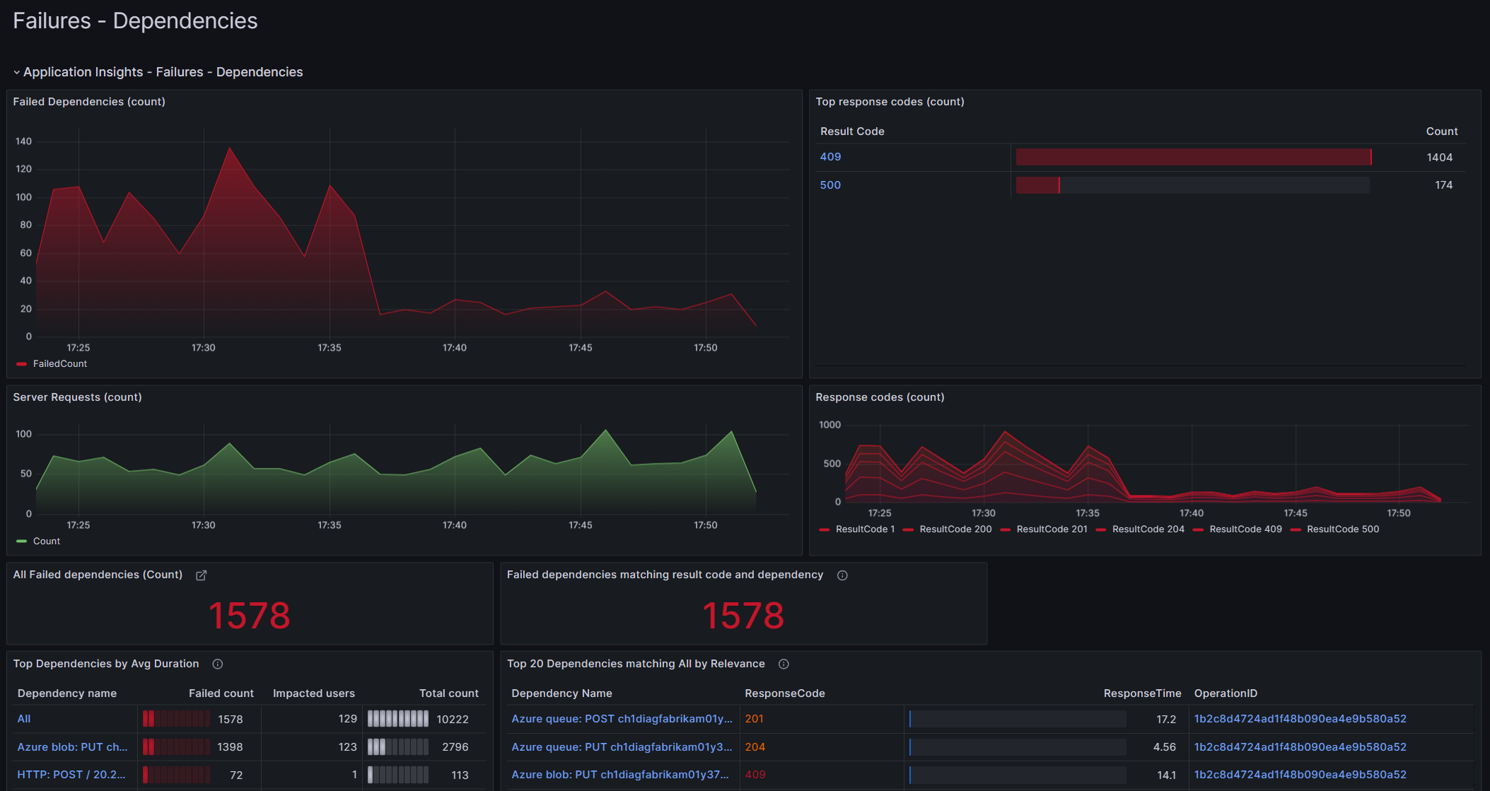 Using Azure Monitor data source, this dashboard provides insights for dependency performance of your Azure Applications with trace viewing capabilities that will allow you to better troubleshoot your application’s usage, reliability, responsiveness and browser usage. You’ll have access to key details like server requests, failed requests, server response time, among others.