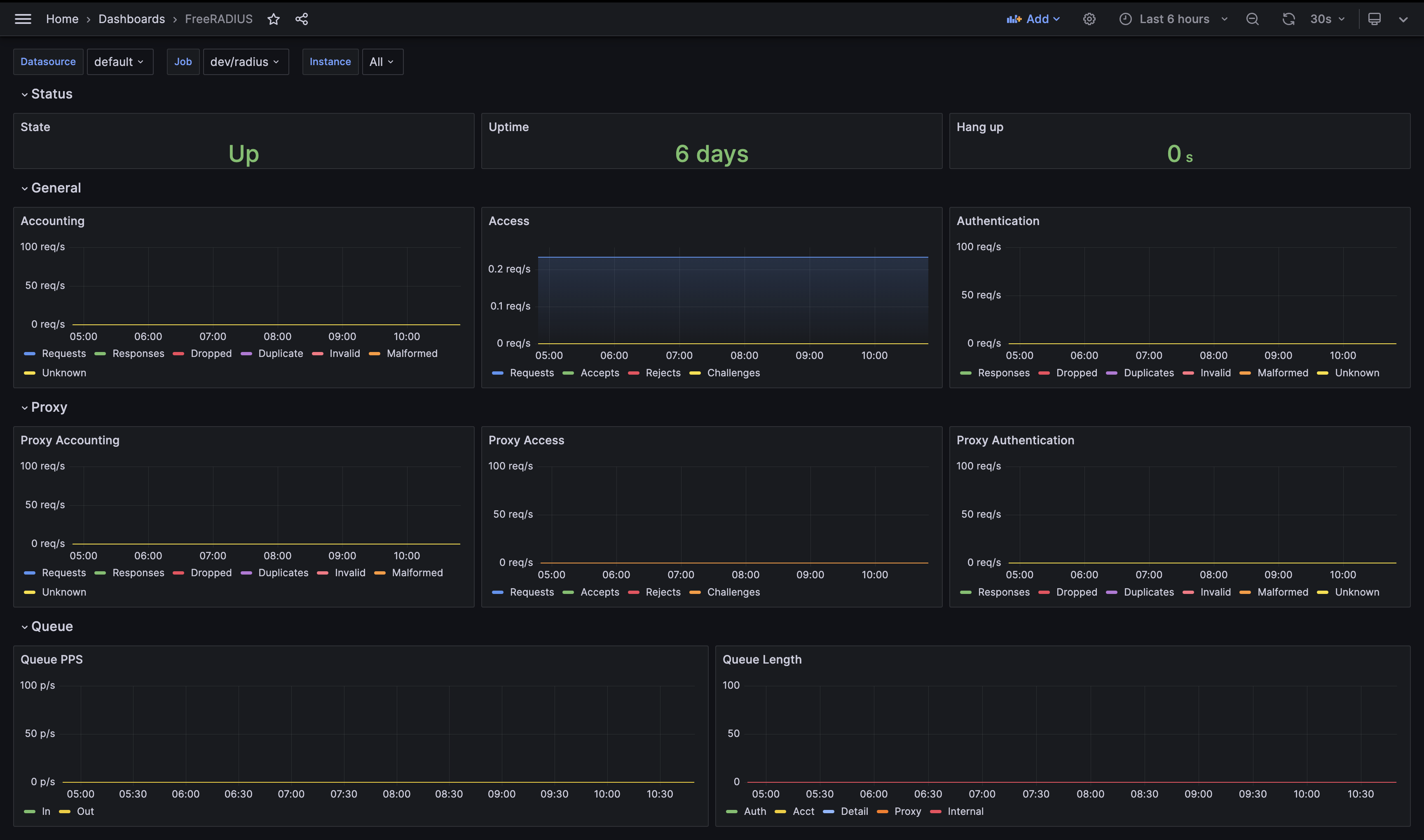 The FreeRADIUS dashboard uses the prometheus data source to create a Grafana dashboard with the stat and timeseries panels.