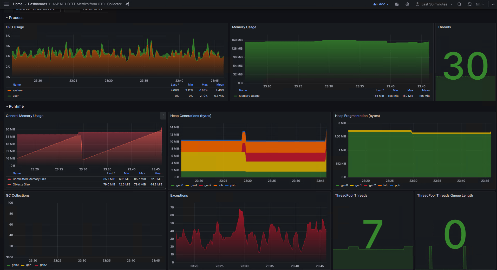 The dashboard shows .NET and ASP.NET (.NET Core/5/6/7) metrics produced by OTLP instruments and injected into an application. These metrics are pushed to the OpenTelemetry Collector. Then, the Collector exposes the metrics to scrape by Prometheus. Then the Grafana dashboard reads the metrics from Prometheus.