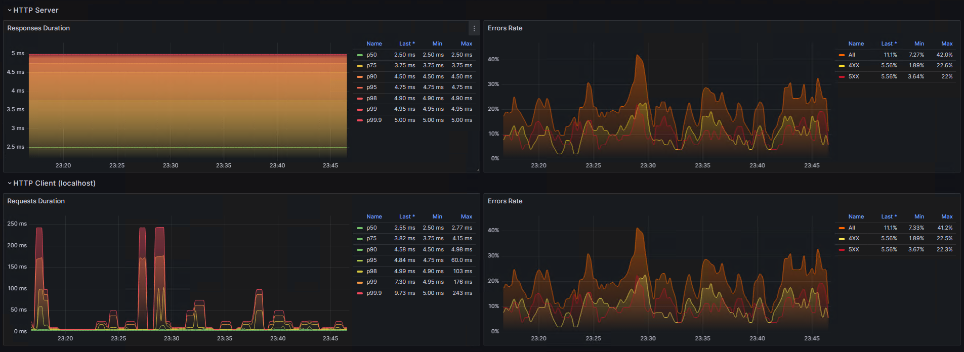 The dashboard was based on the ASP.NET OTEL Metrics dashboard. Metric names were improved according to name rules followed by the OtlpExporter and the Colector.