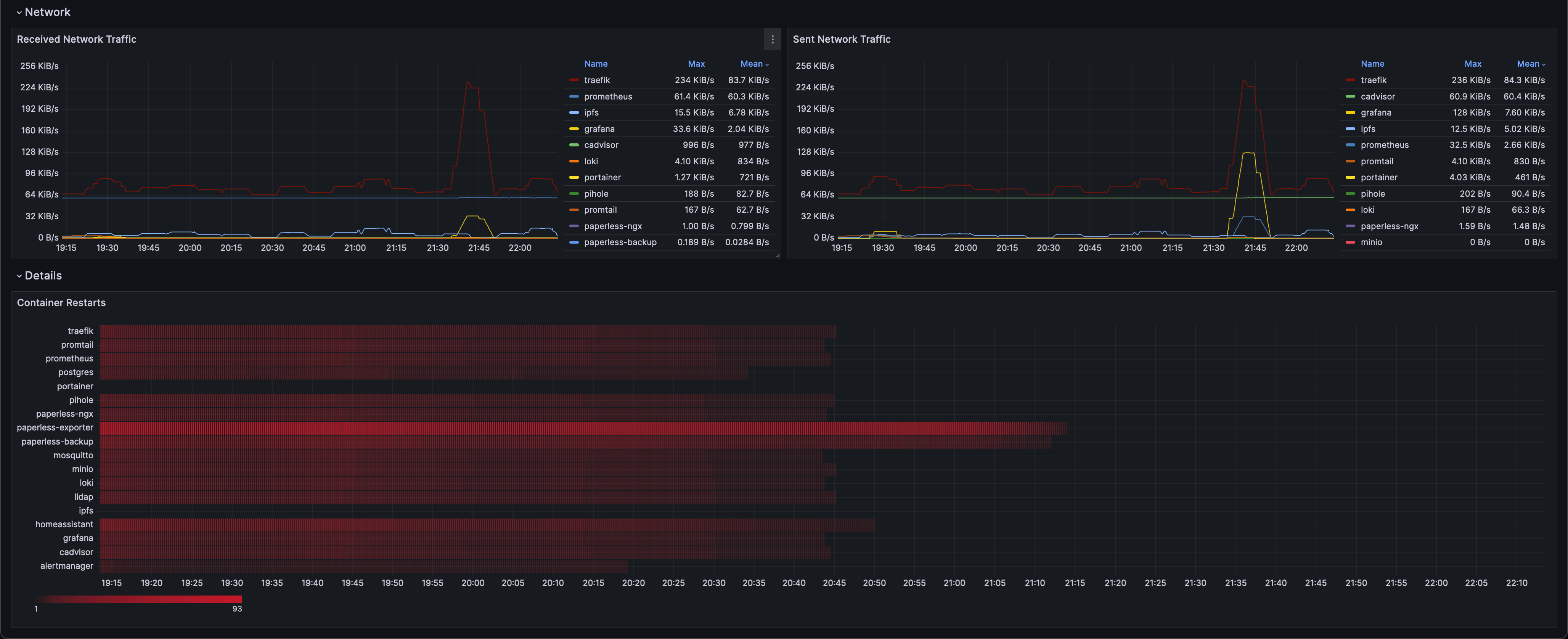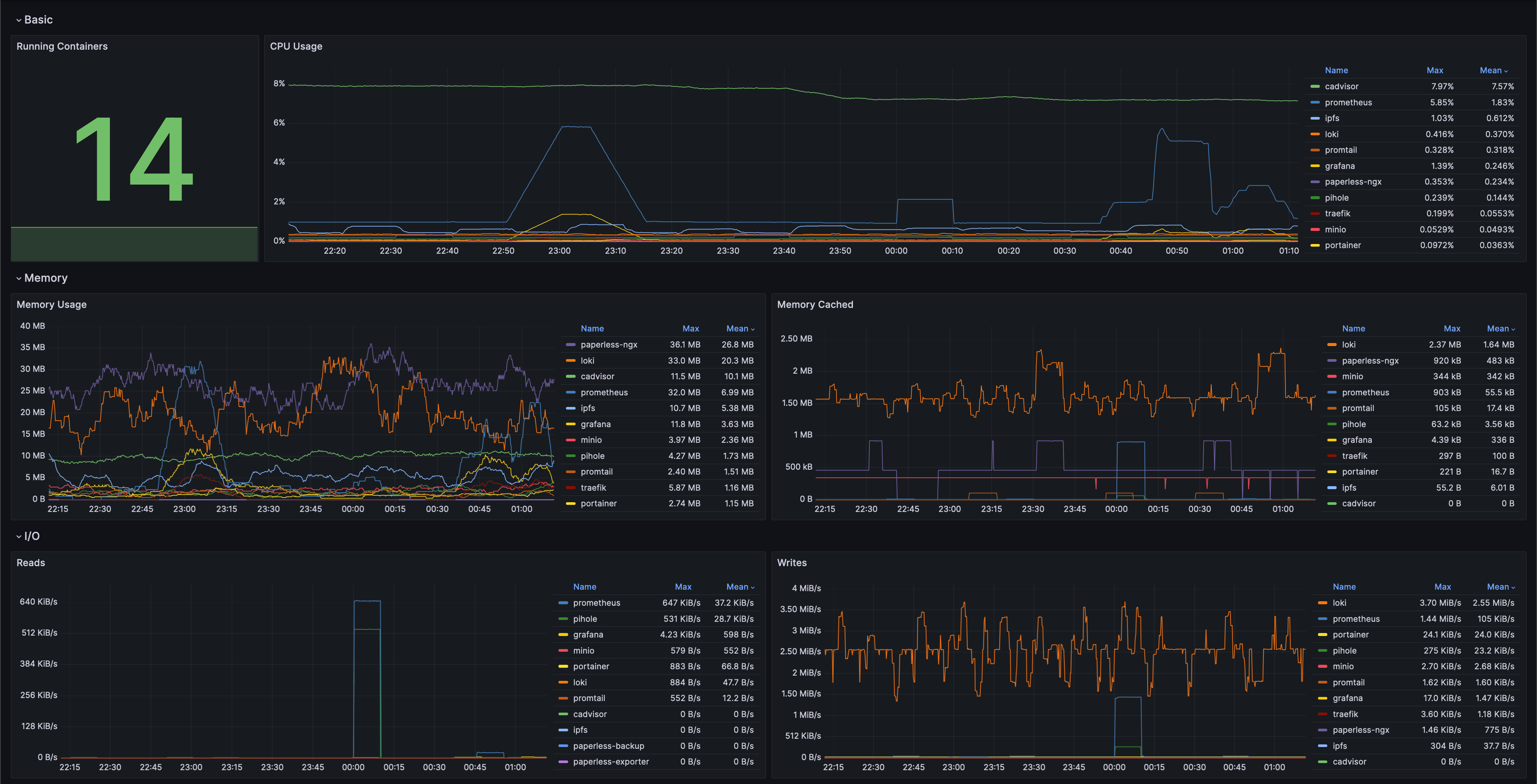 This Grafana dashboard offers a basic overview of key performance metrics for Docker containers in your system. By utilizing Prometheus for data collection and cAdvisor for container-specific insights, it provides a clear view of CPU, memory, I/O, and container restarts, allowing you to monitor and manage your containerized environment effectively.