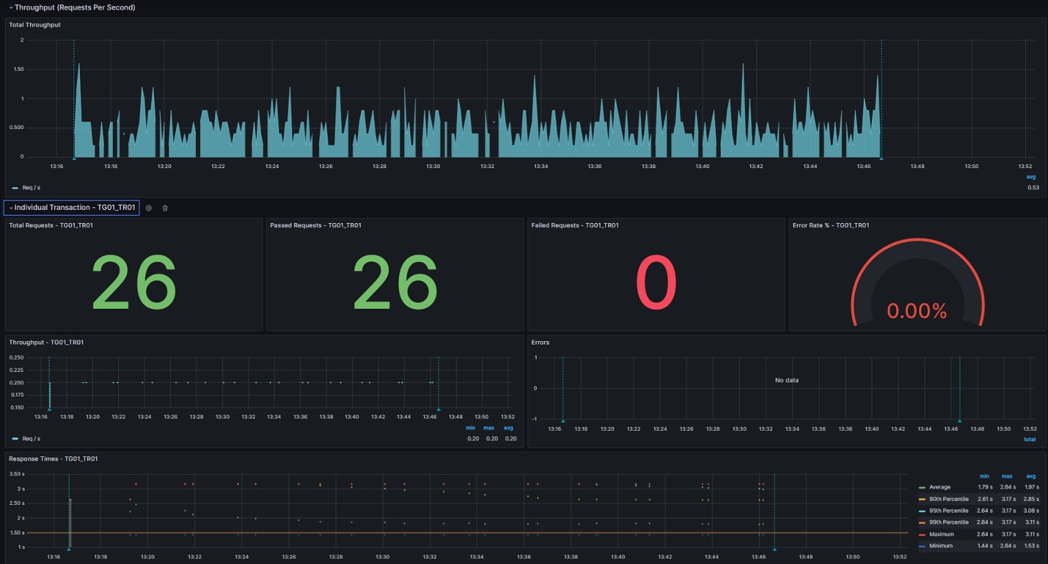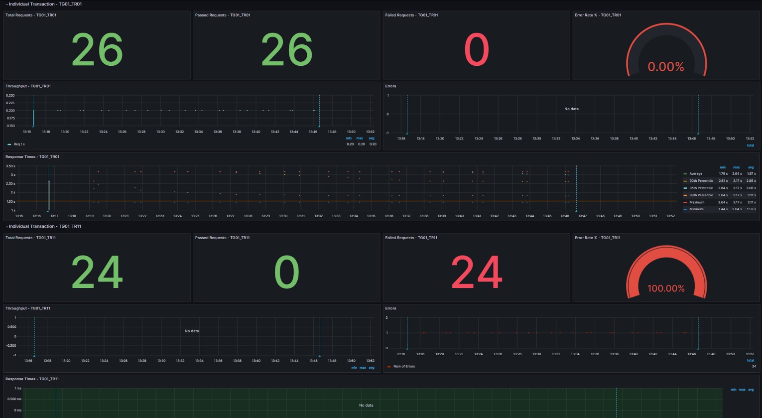 - Response Times for Individual Transaction which includes Minimum, Maximum, Average, 90th, 95th & 99th percentiles