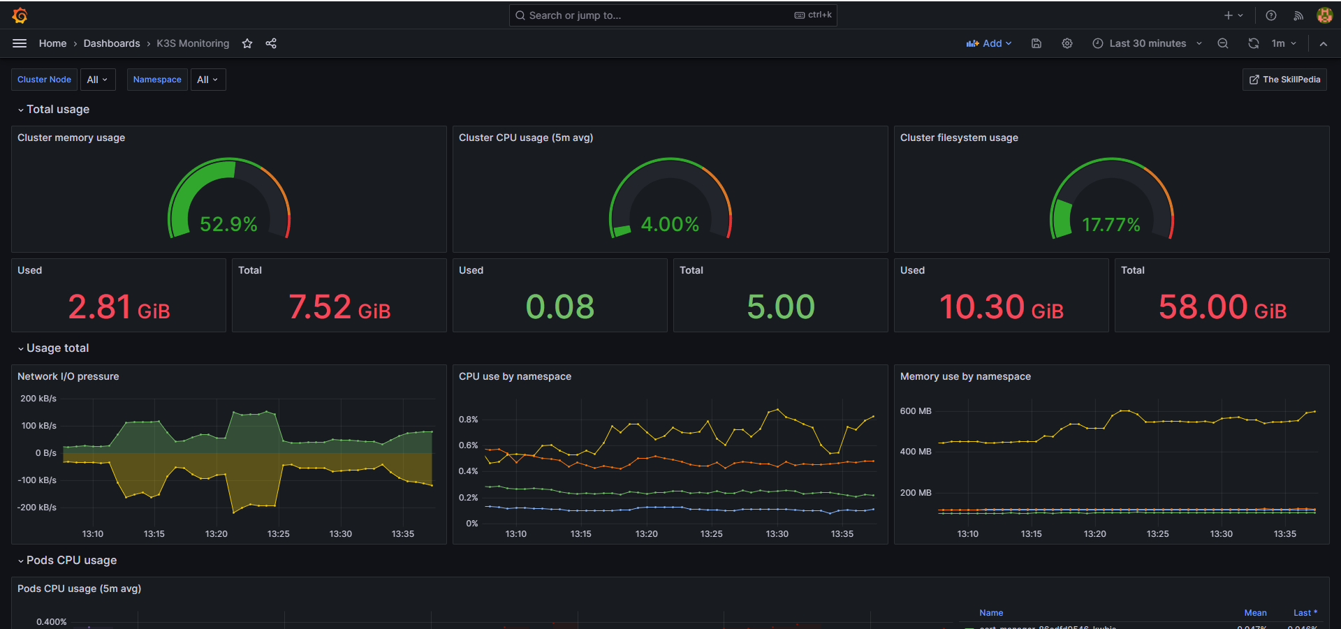 Monitors Kubernetes K3s cluster using Kube-Prometheus. Shows overall cluster CPU / Memory / Filesystem usage as well as individual pod, containers, systemd services statistics. Uses cAdvisor metrics only.