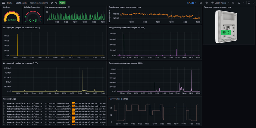 This is an example of a dashboard for a web exporter from Keenetic devices working as an access point. Displays Uptime, download by radio channels, table and frequency of log files by STA This project is used to import data, https://github.com/vitaliy-sk/keenetic-grafana-monitoring