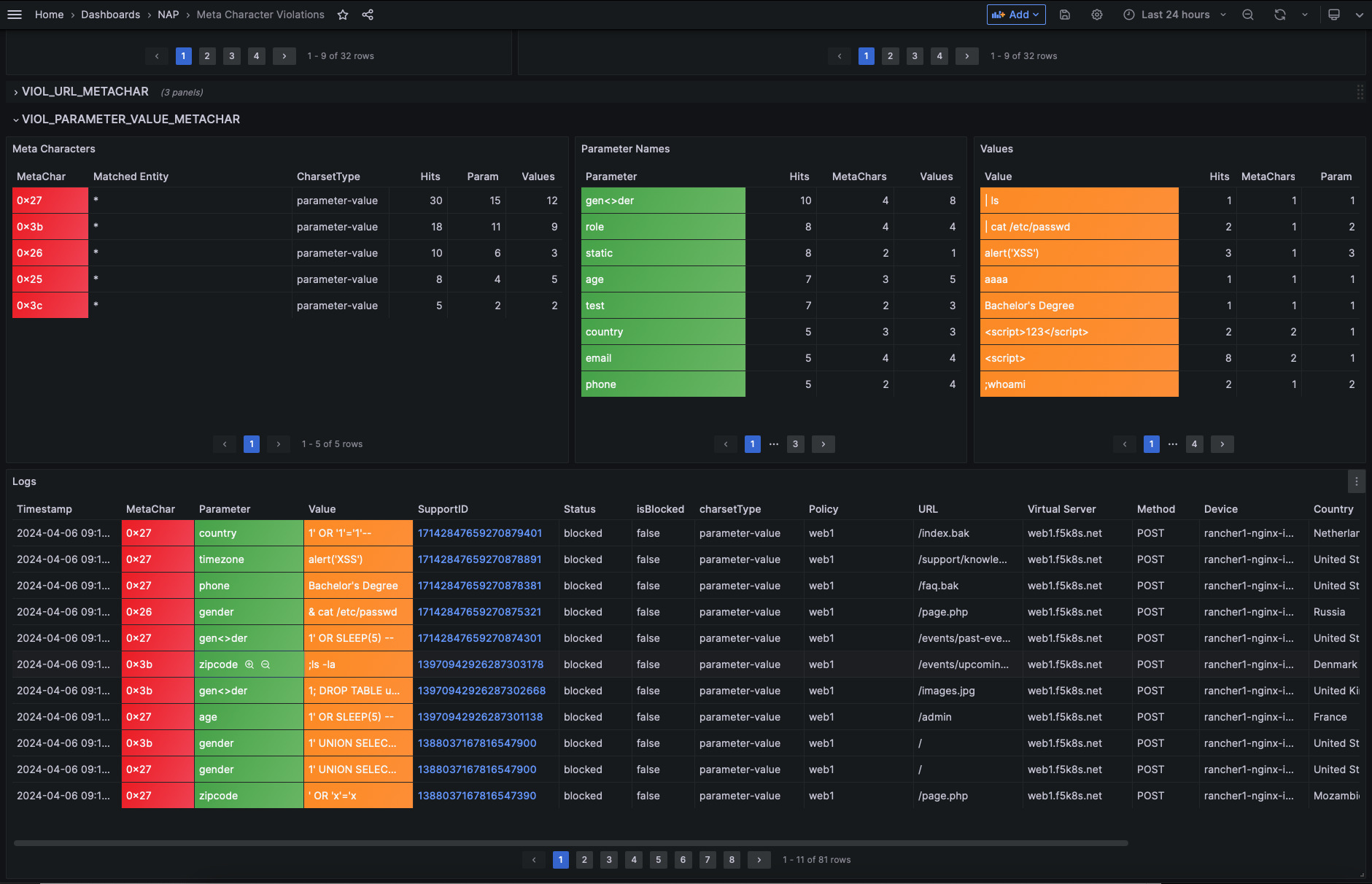 This Dashboard provides more visibility into the logs generated by NGINX App Protect. This is part of a series of NGINX App Protect Dashboards