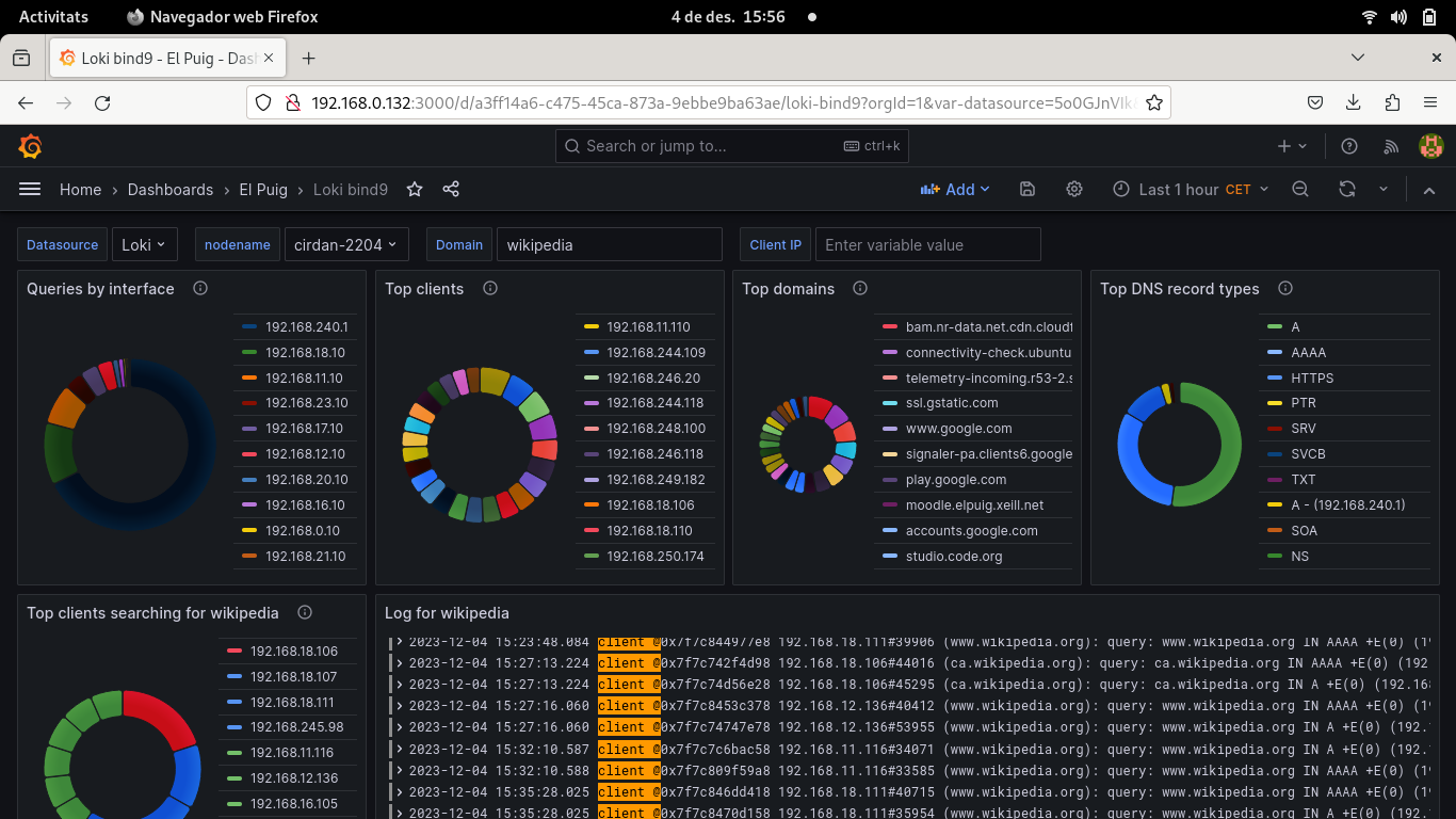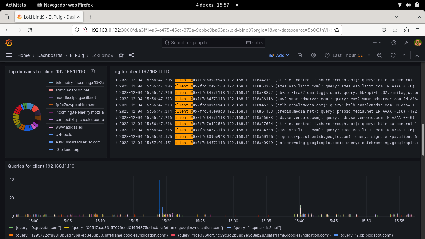 Uses Loki to display usage of BIND9. You need to activate DNS log queries in BIND9.