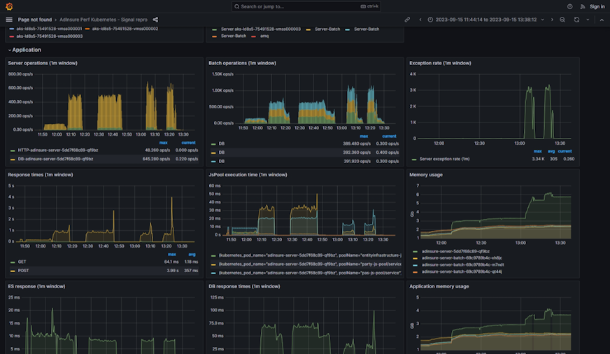 The AdInsure Perf v27 Kubernetes dashboard uses the grafana-azure-monitor-datasource and prometheus data sources to create a Grafana dashboard with the graph, heatmap, stat and timeseries panels.