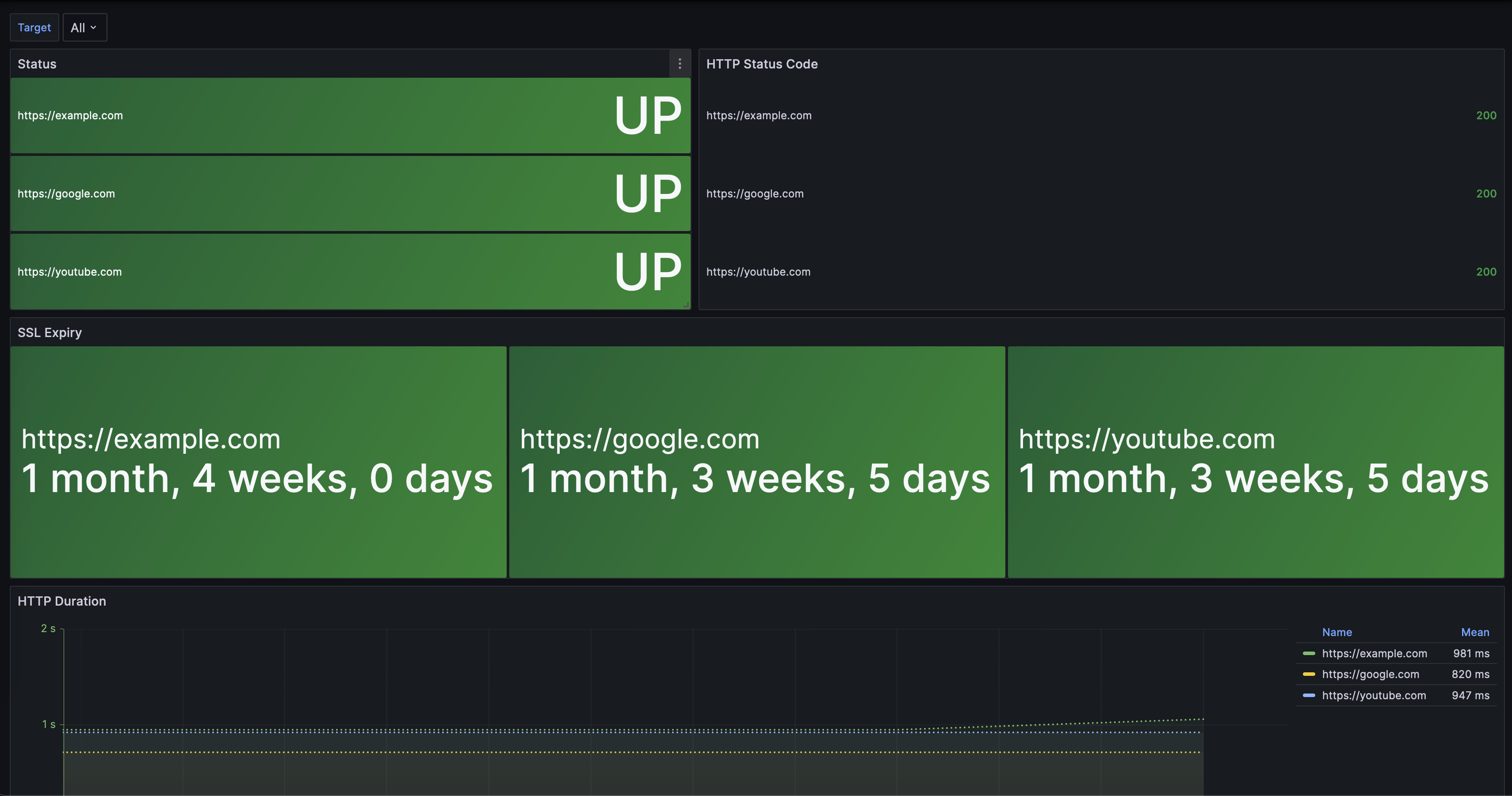 Prometheus Blackbox Exporter Overview Minimal View showing status, SSL expiry and duration graph