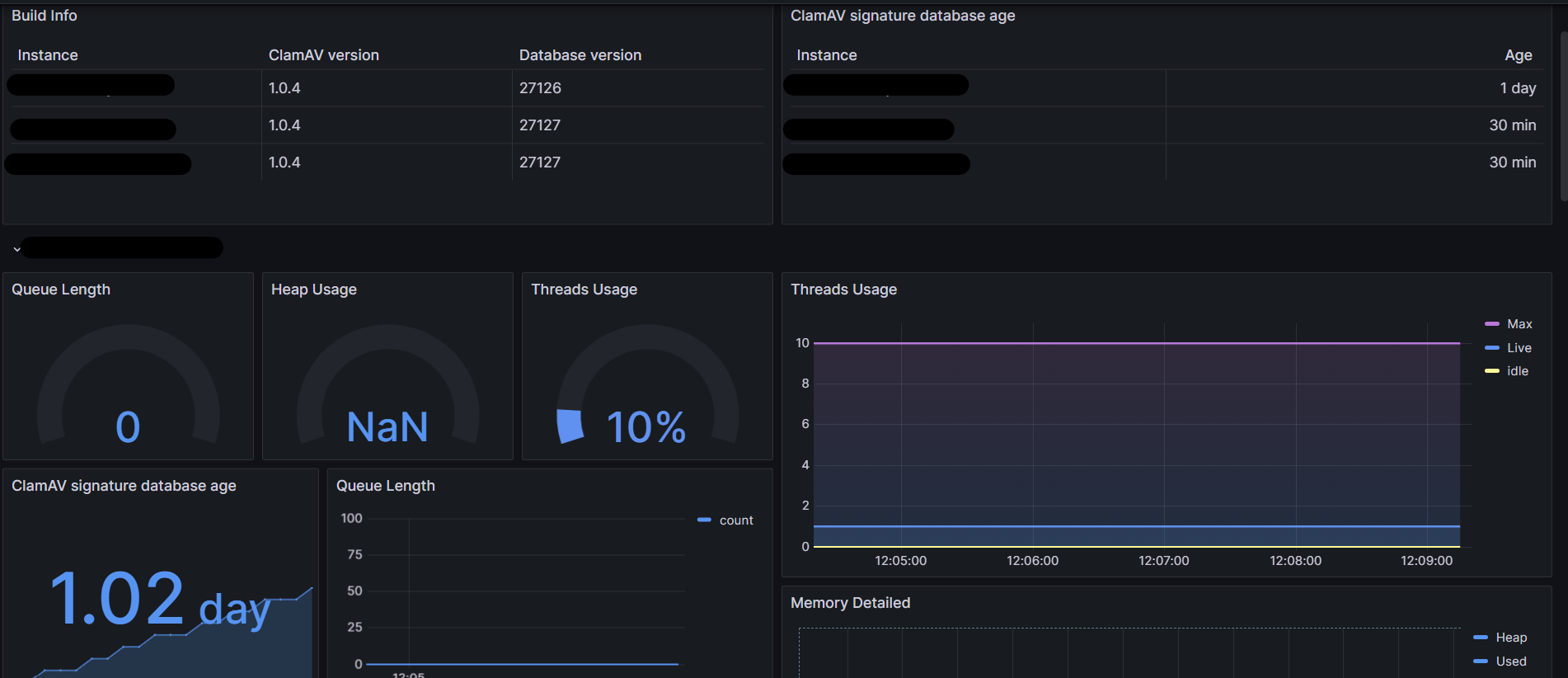 The Carbonio ClamAV dashboard uses the prometheus data source to create a Grafana dashboard with the gauge, stat, table and timeseries panels.