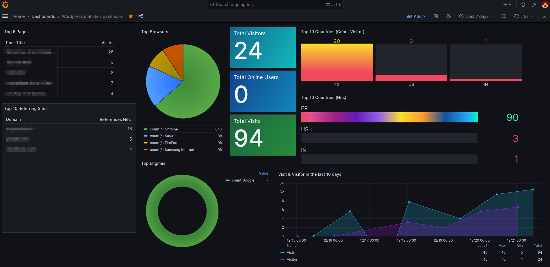 Wordpress statistics dashboard includes: - Top 5 pages - Top browsers - Top 10 Referring Sites - Top Engines - Total Visitors - Total Online Users - Total Visits - Top 10 Countries (Count Visitor) - Top 10 Countries (Hits) - Visit & Visitor in the last 10 days