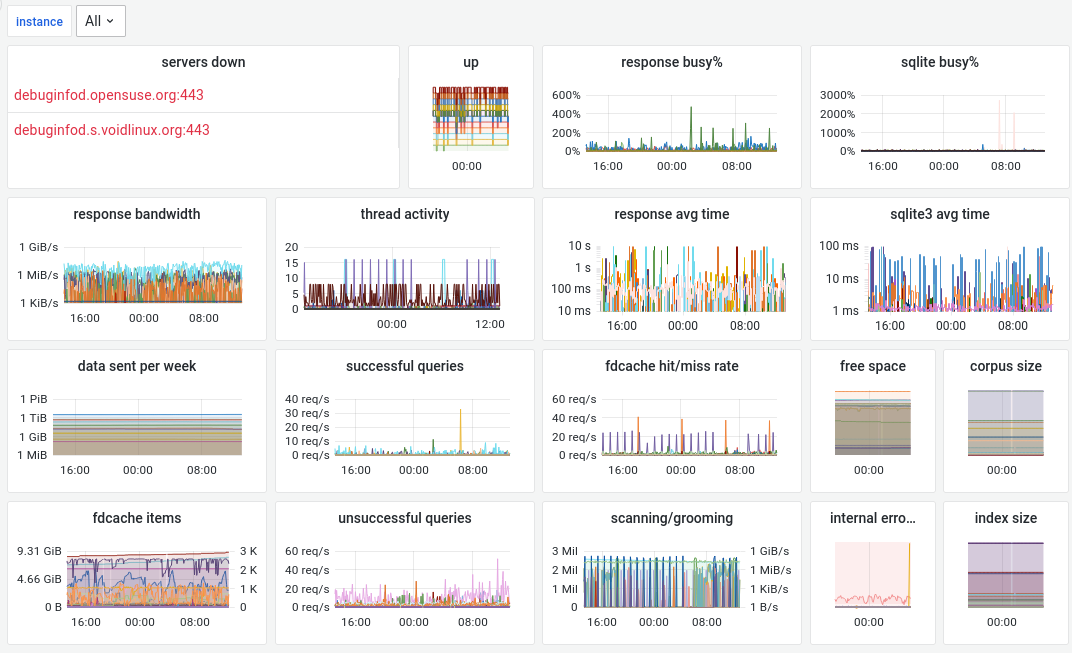 This dashboard views a selection of the prometheus metrics built into the debuginfod server, used for supplying debugging data such as ELF/DWARF/source code content to debuggers and similar tools.