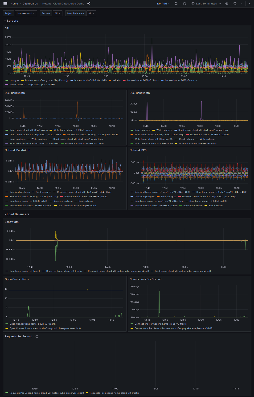 The Hetzner Cloud - Servers & Load Balancers dashboard uses the data source to create a Grafana dashboard with the panel.