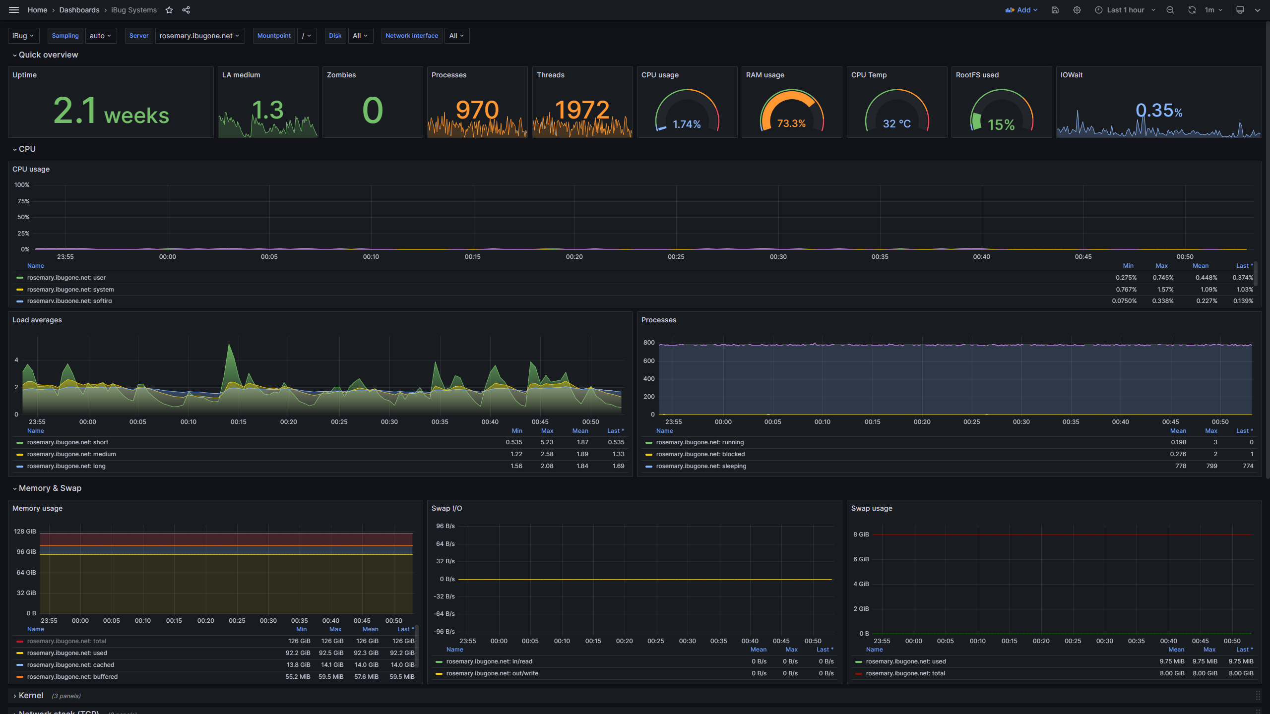 An updated version of 928 - Telegraf: system dashboard, with the same templating and repeating rows, but refreshed for Grafana v10.