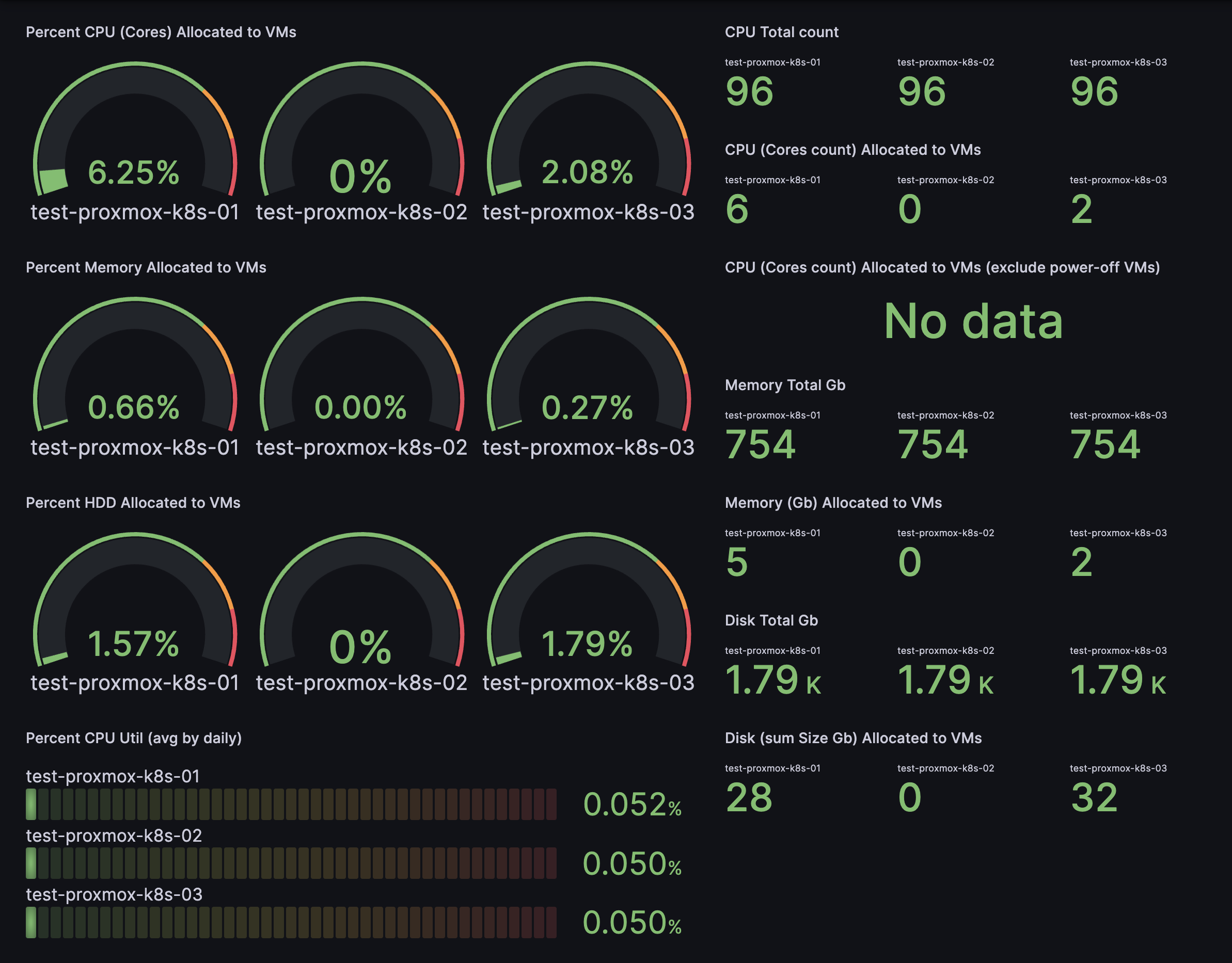 First you need install Proxmox exporter https://github.com/steemax/prox-metrics work with prox-metrics exporter only (https://github.com/steemax/prox-metrics), use Prometheus datasource, collects information about allocated resources for VMs to avoid oversubscription or evenly distribute newly created VMs