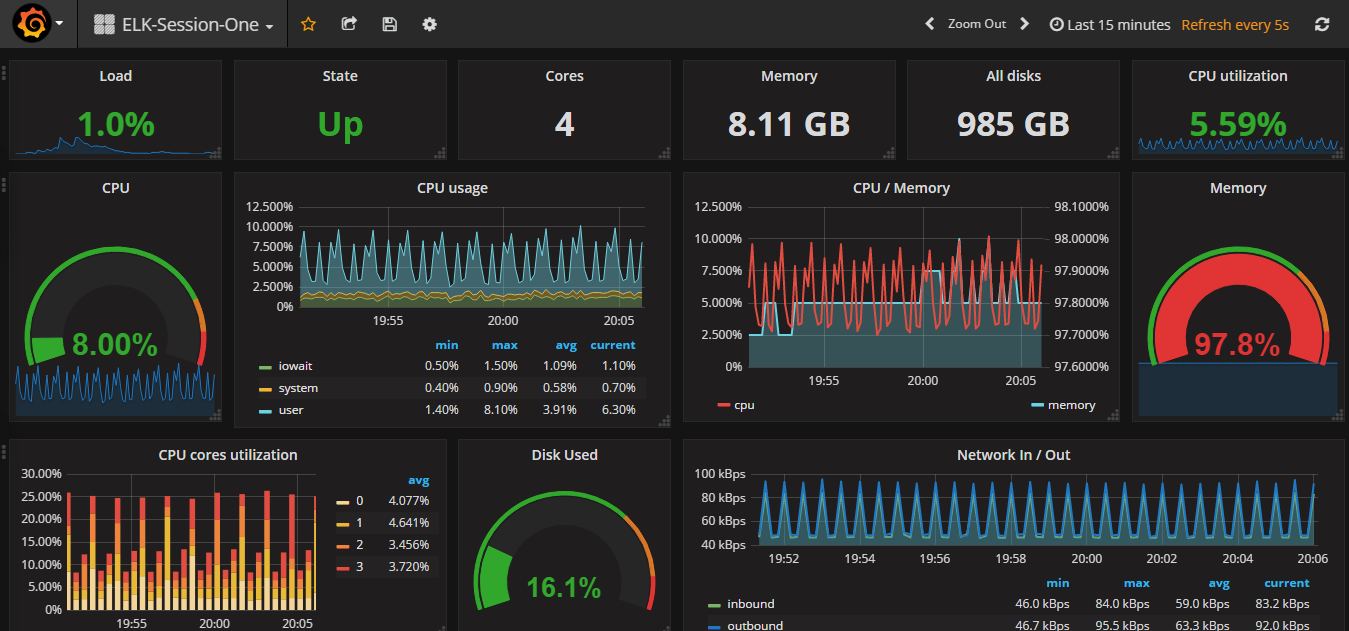 Dashboard from metricbeat metrics of the OS. This dashboard is served as a demonstration for Grafana training.