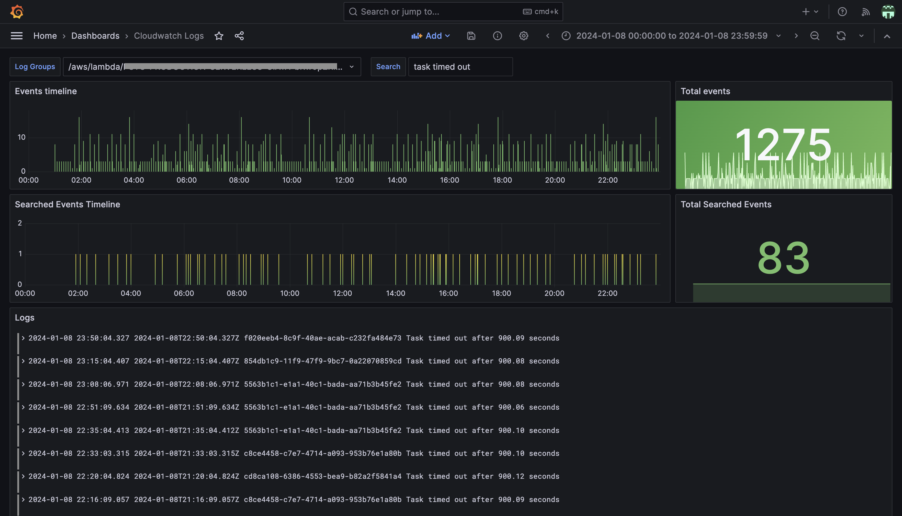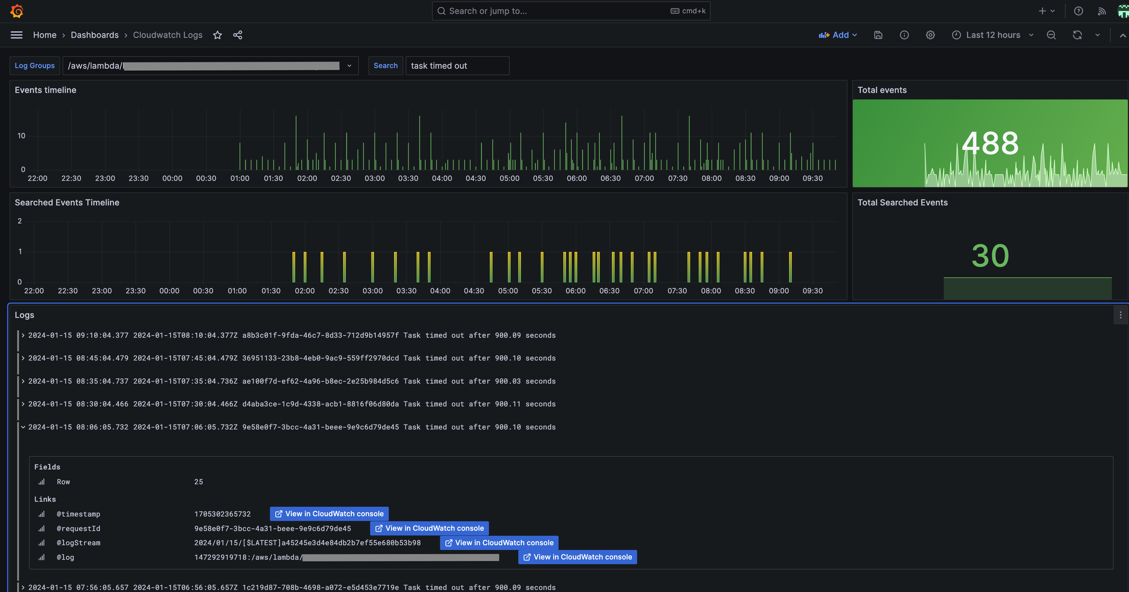 An AWS CloudWatch logs dashboard, for fetching CloudWatch logs by log groups with the possibility of searching by any terms to filter the log results (the log result contains all the metadata needed to debug: requestId, timestamp, logStream, ...). The dashboard contains the following: - Log results panel - Log results distribution panel - Total results panel - Incoming log events distribution panel - Total incoming log events panel