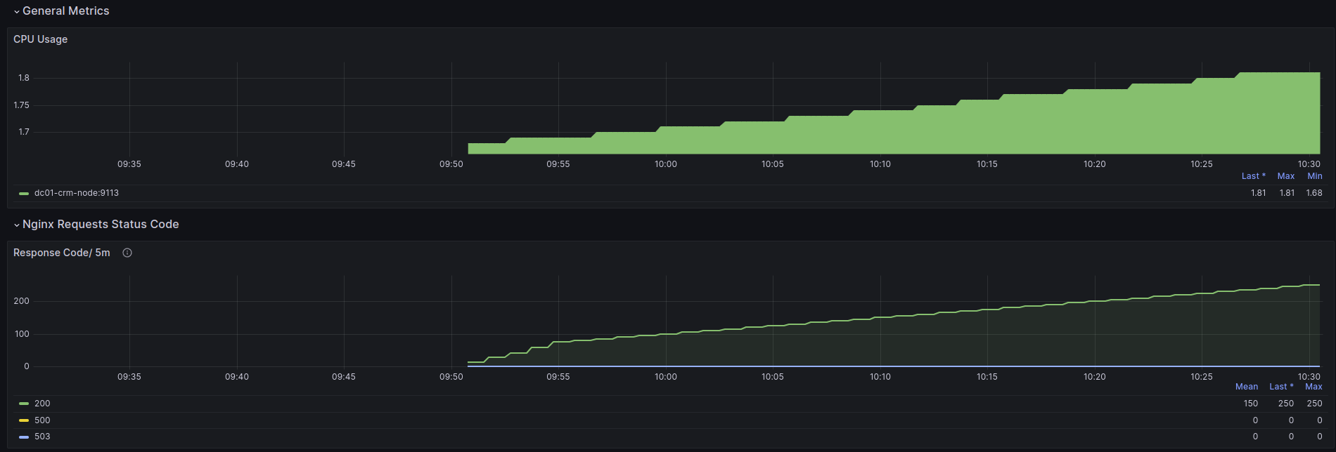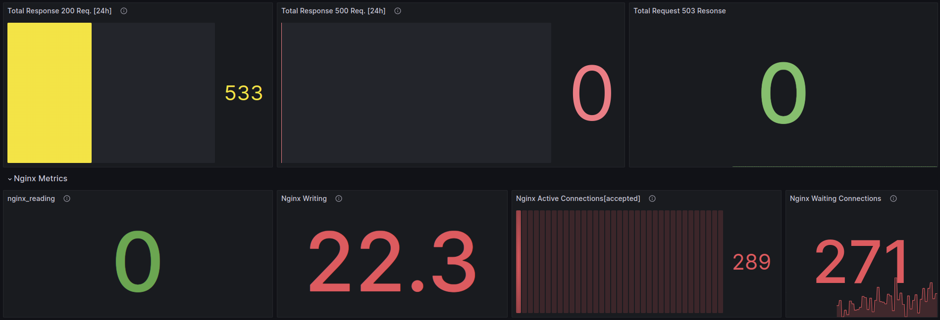 - Current CPU Utilization % - Response 2XX / 5m - Total Response 200 Req. [24h] - Response 5XX - Total Request 503 Resonse - Nginx Connections Accepted - Nginx Writing - Nginx Active Connections[accepted] - Nginx Waiting Connections - Handled Request - Nginx Requests - nginx_reading