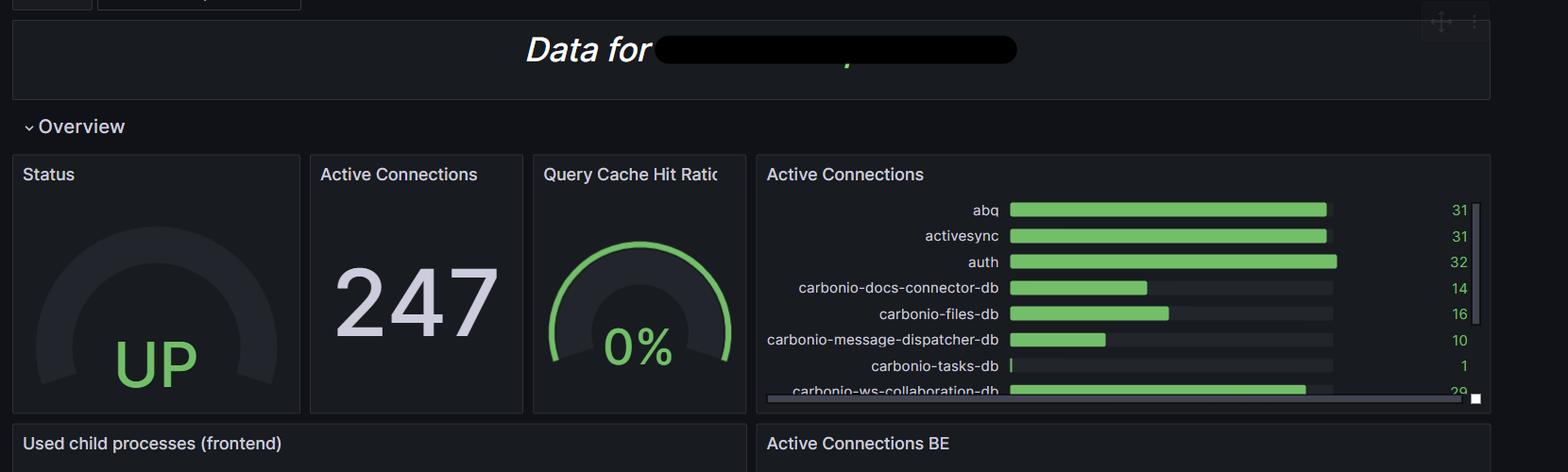 The Carbonio Pgpool2 dashboard uses the prometheus data source to create a Grafana dashboard with the bargauge, gauge, stat, text and timeseries panels.