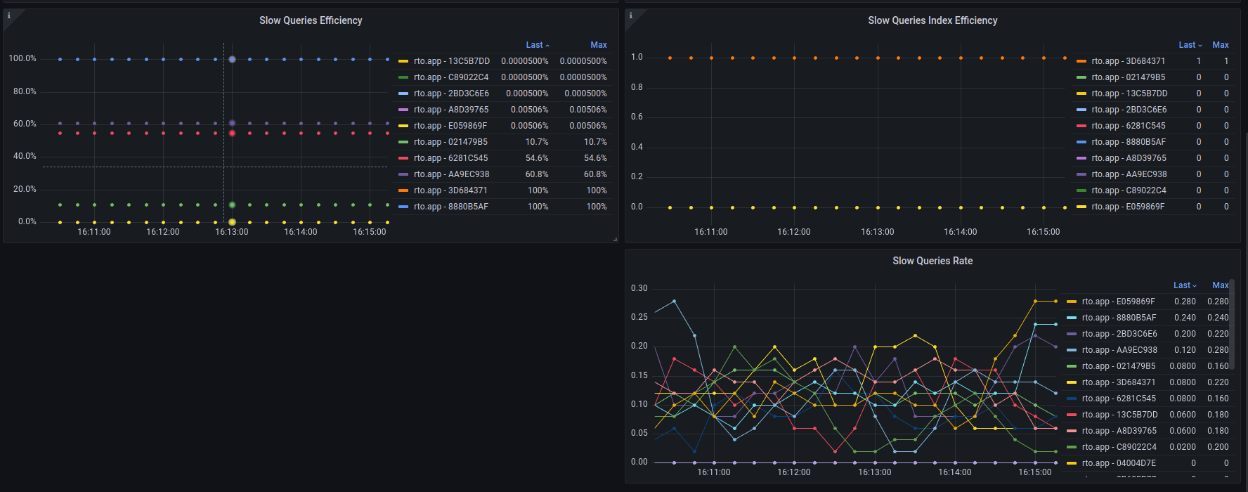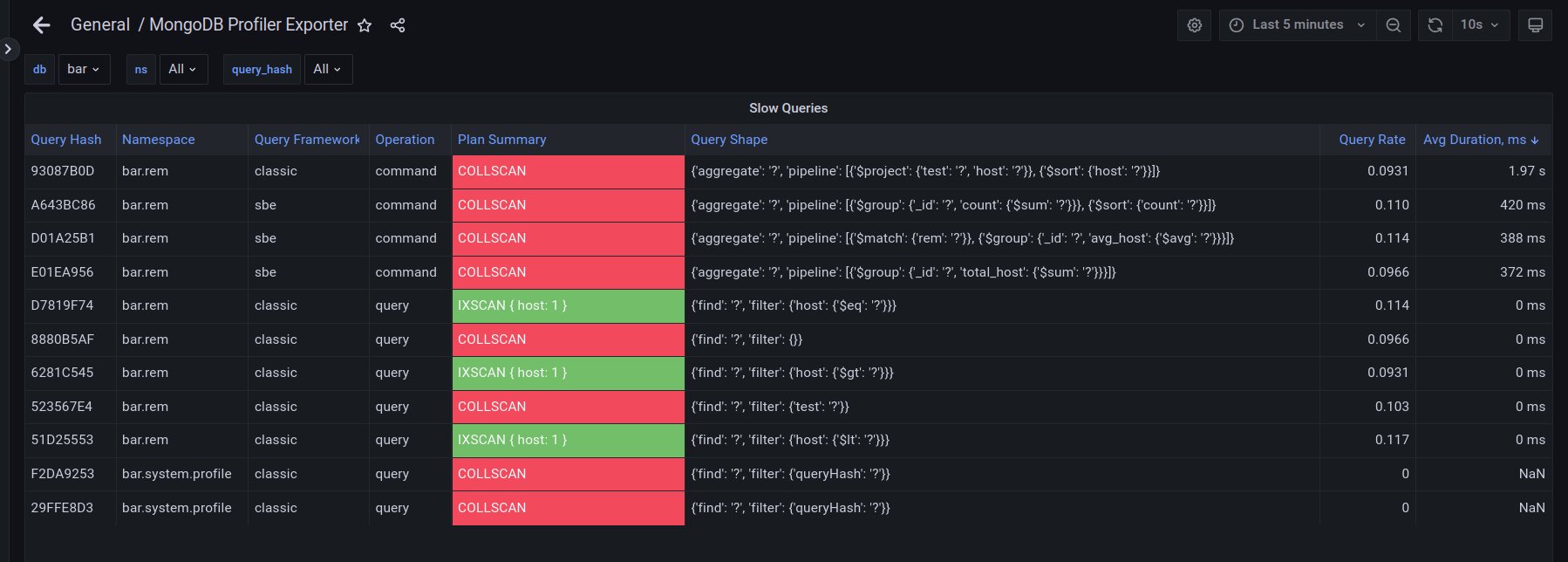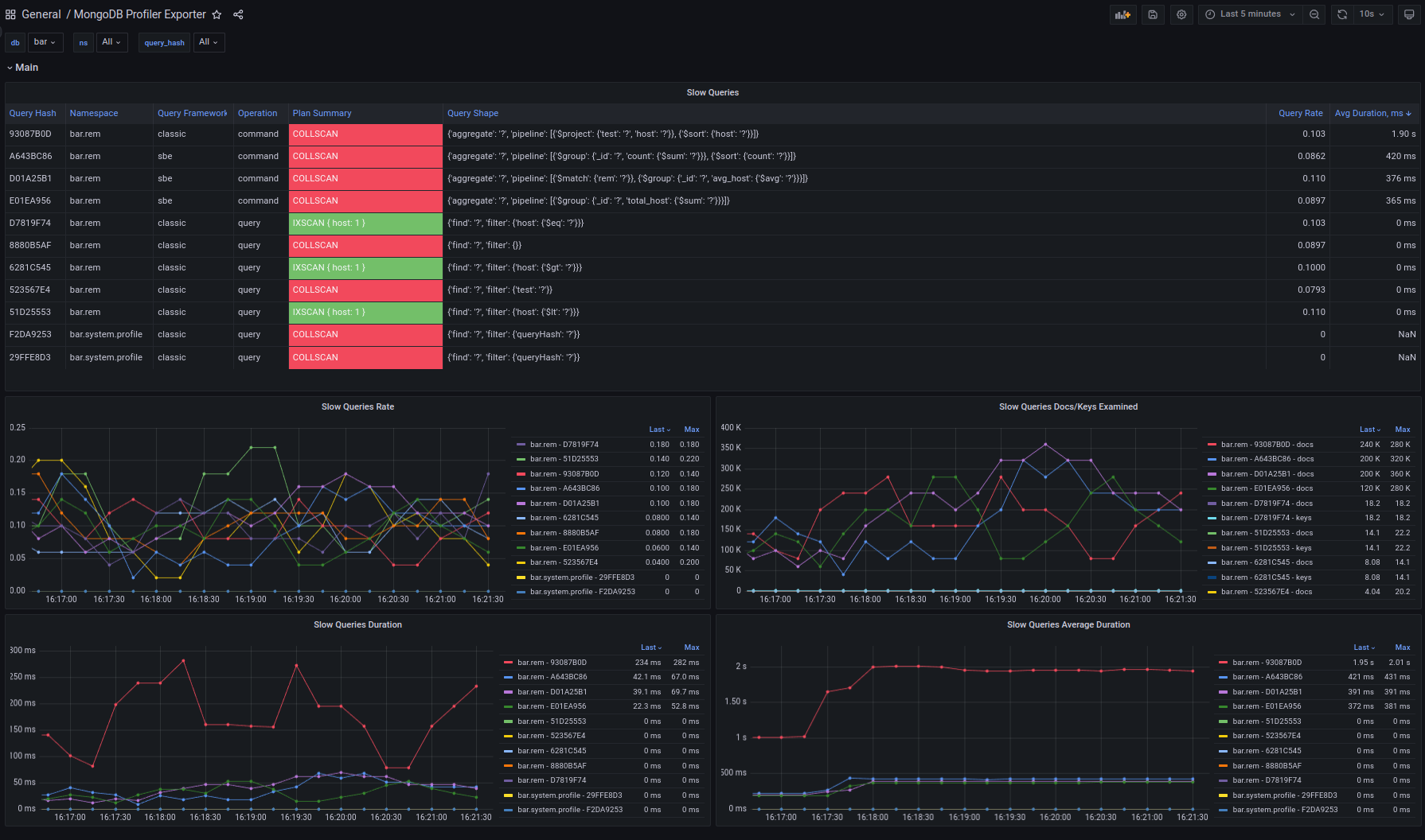 This exporter regularly retrieves data from the system.profile collection and consolidates it into metrics. Additionally, the exporter fetches query shape examples for each queryHash, enabling the creation of an informative table detailing slow queries.