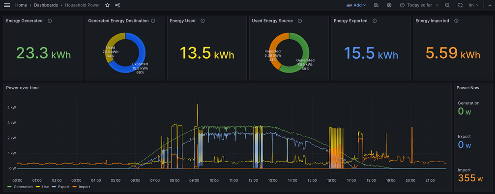 This dashboard is designed to be used with the SEMS MITM Prometheus Exporter. It provides an overview of household power usage.