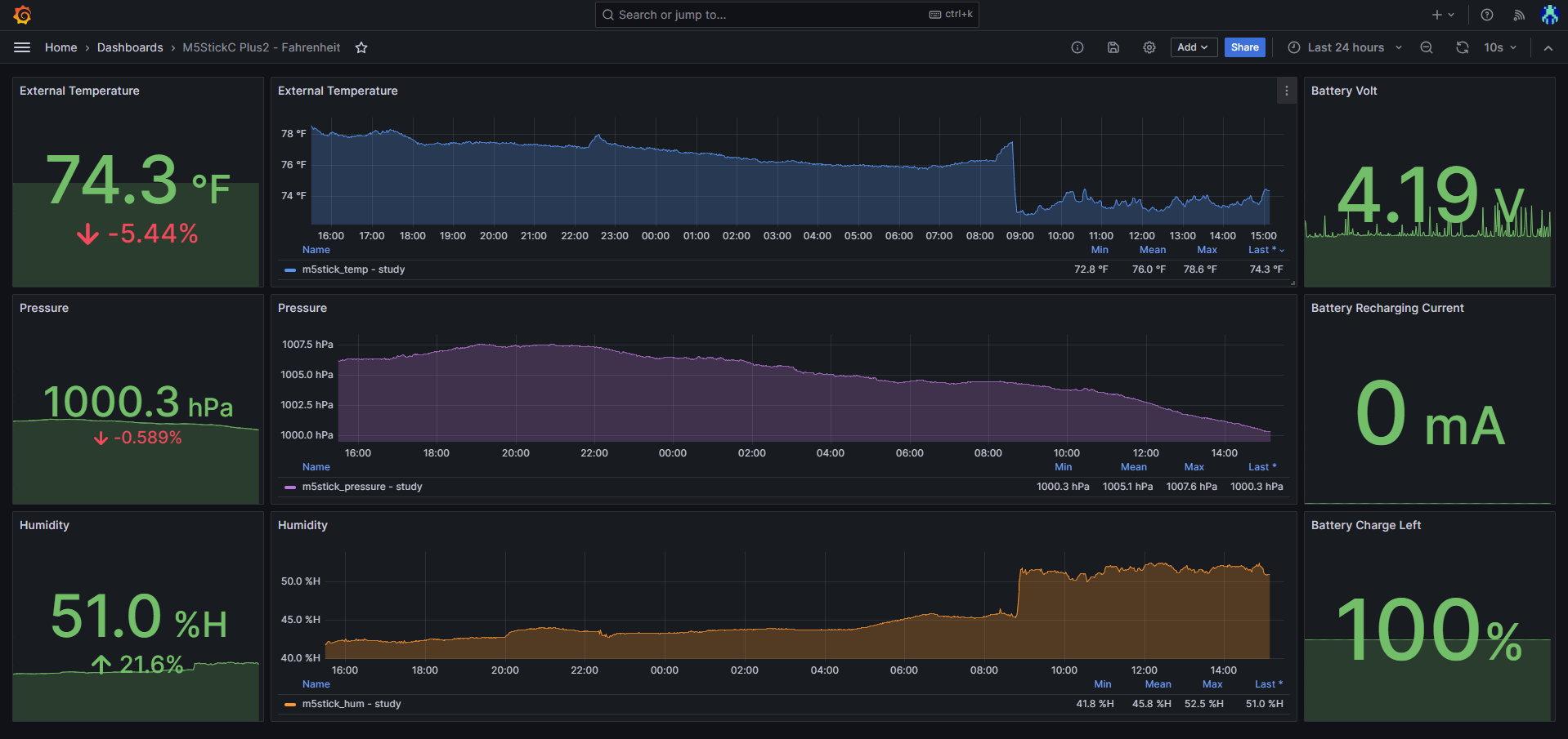 Example Dashboard to visualise your temperature/humidity/pressure metrics when pairing the M5StickC Plus2 with the ENV III sensor.
